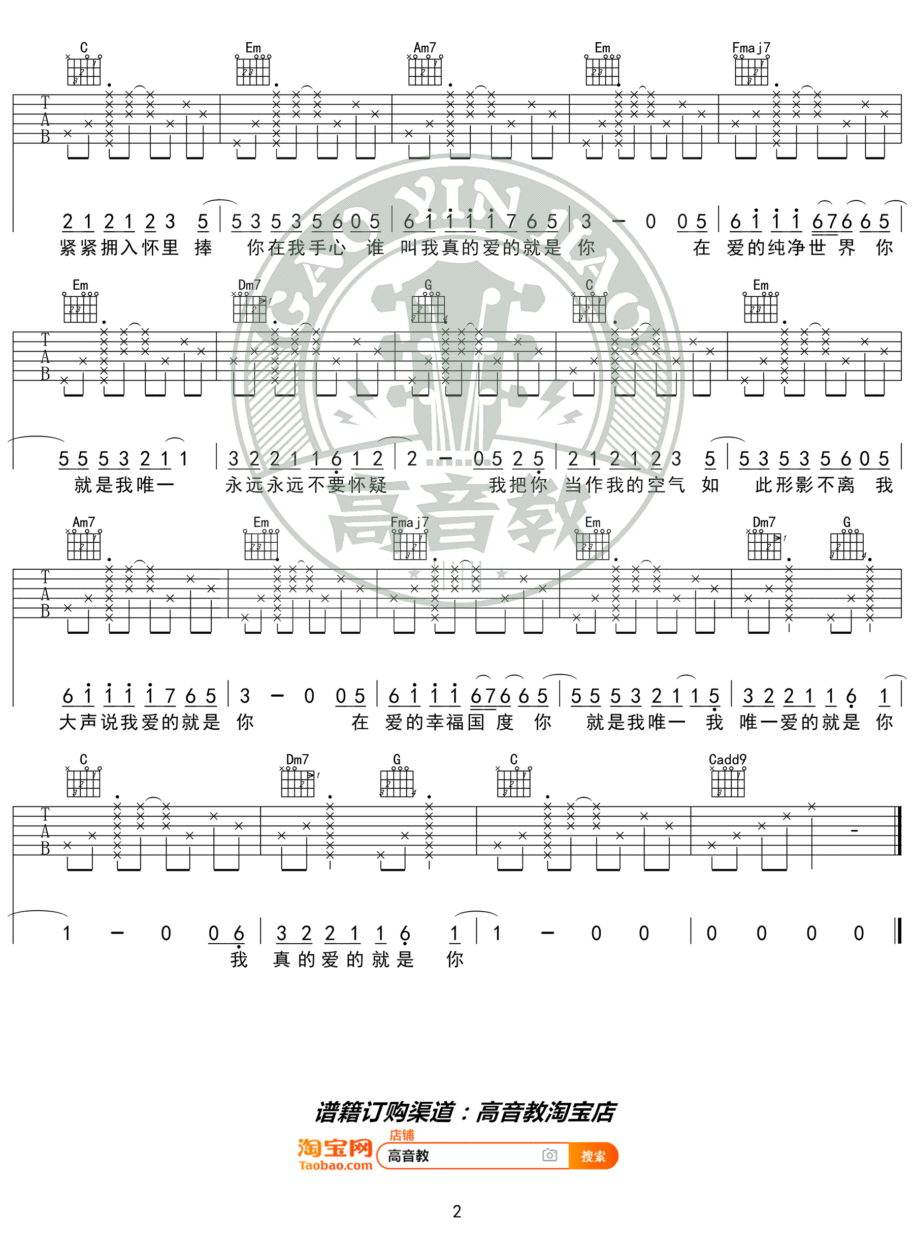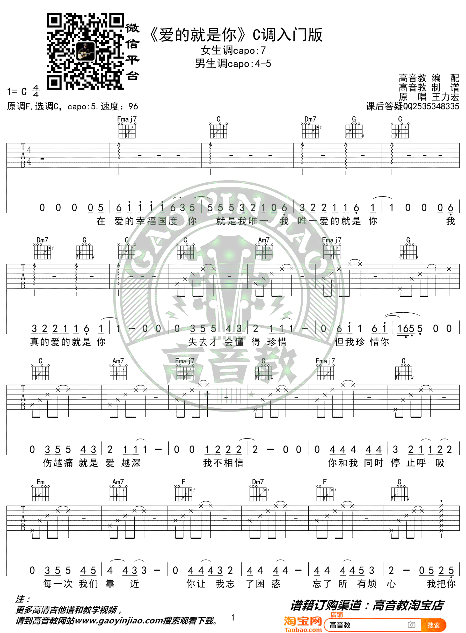 曲谱介绍: 《爱的就是你》吉他谱,王力宏演唱,原调F,选调C,变调夹夹五品。爱的就是你六线谱,入门版编配,高音教出品,吉他源整理分享。