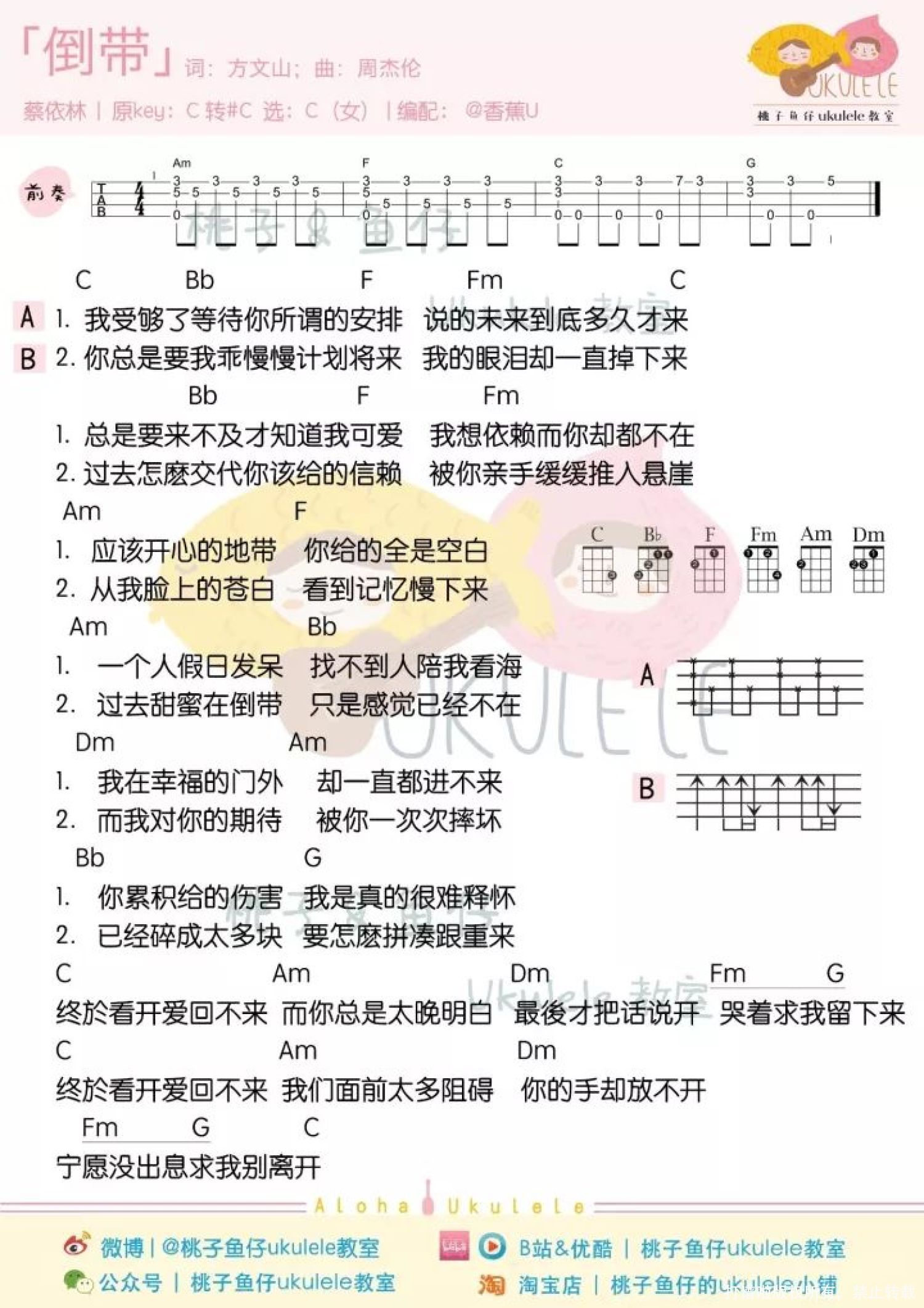 曲谱介绍: 蔡依林的倒带是女生对失去爱的渴望 杰伦的倒带是对逝去爱的无奈 萧敬腾的倒带是对死去爱的缅怀   《倒带》尤克里里谱 女声版   男声版