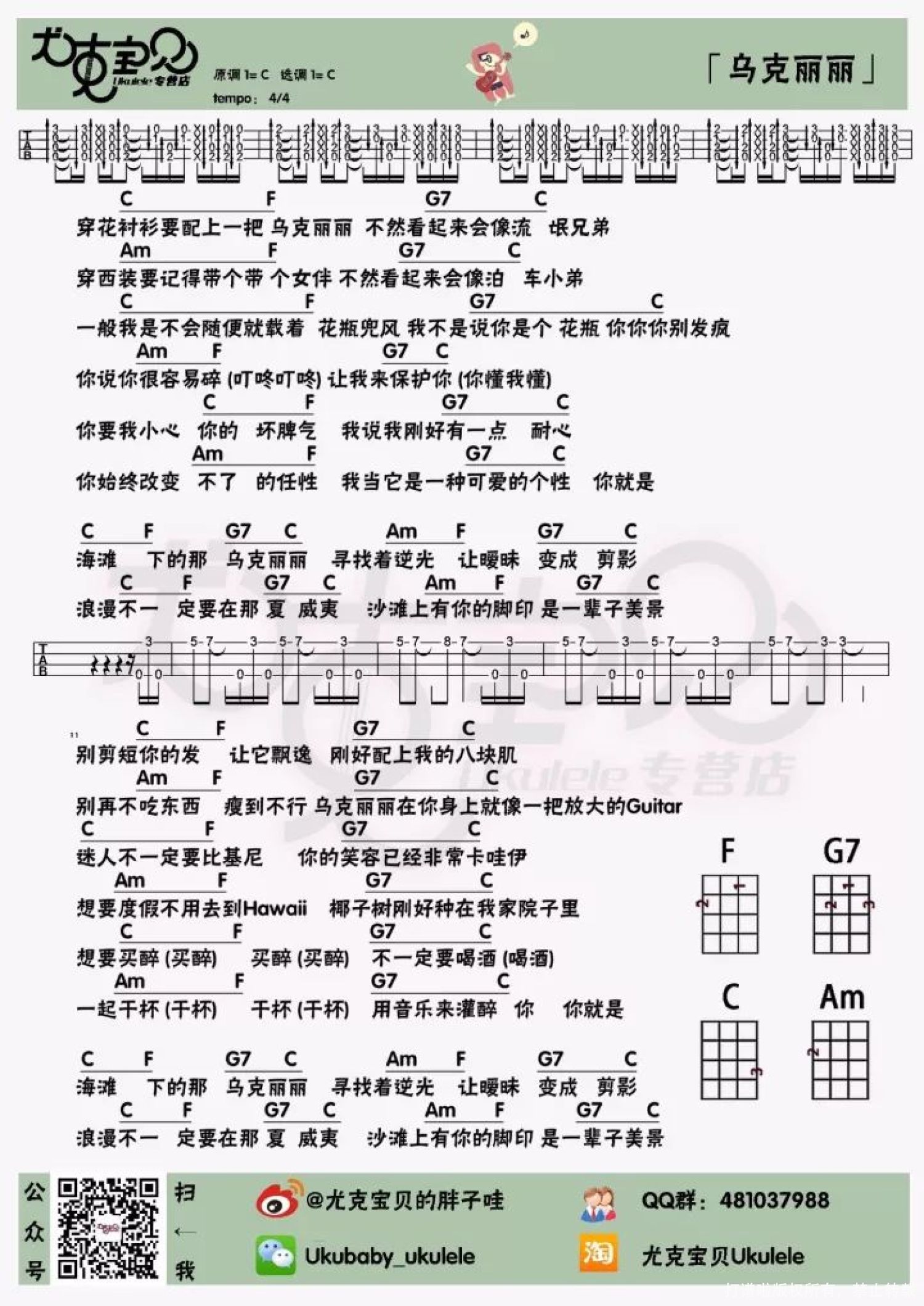 曲谱介绍: ●「乌克丽丽」是由周杰伦演唱,并作曲、作词,林迈可编曲。收录在周杰伦2012年发行的专辑《十二新作》中 ●这首歌曲是周杰伦以夏威夷传统拨弦乐器乌克丽丽为主题而创作的一首民谣情歌,描述女孩的美丽、温柔宛如乌克丽丽。 ● 《乌克丽丽》融合了很少人用的电子嘻哈曲风,旋律轻快,朗朗上口,曲风清新,层次简洁。这首歌曲不是靠砸乐器砸效果去营造氛围,编曲有层次感。   乌克丽丽•尤克里里•Ukulele Ukulele<夏威夷四弦琴> = 尤克里里<国内> = 乌克丽丽<港台> 发明于葡萄牙 盛行于夏威夷 ●"ukulele"在夏威夷语中指的是另一种西方传入的东西:猫蚤。“Uku”是「跳蚤、娇小」,而“lele”是「蹦跳」。有学者的说法是夏威夷原住民在弹这把乐器时的指法灵活多变,彷佛跳蚤在弦间跳跃。 ●乌克丽丽被称为「全世界最简单好听的弹唱乐器」以及 「疗伤系乐器第一名」,轻轻弹拨之间,彷佛海风吹拂,浪花拍打,与夏威夷风光彷佛就是天生一对。 ●虽然乌克丽丽不是夏威夷亲生的,然而正是在不同民族的迁徙与地方色彩的融合中,逐渐形成了我们现在的生活样态;传统可以舶来,这才是文化最有趣的地方。   弹唱教学   弹唱曲谱-C调