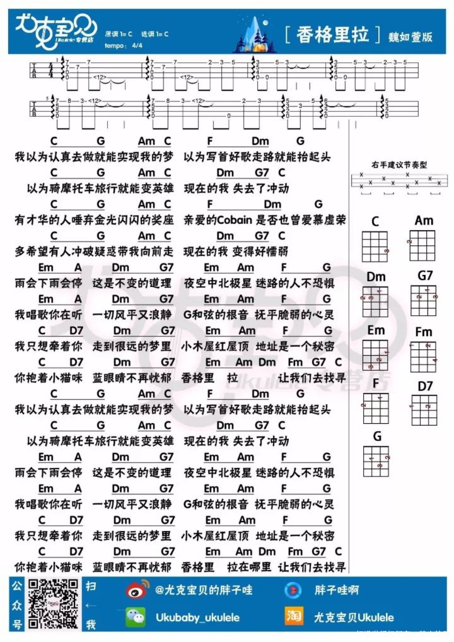 曲谱介绍: ●「香格里拉」收录于魏如萱2011年的EP《在哪里》,是电影《花吃了那女孩》的配乐。 ●《香格里拉》是在魏如萱的早期作品里,最受歌迷喜爱的一首,只要前奏响起大家就都能跟自然跟着轻轻哼的歌。 ● 单曲循环的时候会闭上眼睛,是一个梦。我们手拉着手,去找寻那个地址是个秘密的小木屋,那里有一只我们都熟悉的猫咪,在太阳底下慵懒地挠挠痒儿,优雅撩人。 你抱著 小猫咪 蓝眼睛不再忧郁 香格里拉 在哪里 让我们去找寻   可以说金曲奖对魏如萱一直都青睐有加,2016年,魏如萱个人第五张专辑《末路狂花》更是大获认可,入围17年第28届金曲奖最佳国语女歌手、最佳国语专辑、最佳作曲人、年度专辑四项大奖提名。   弹唱曲谱-C调