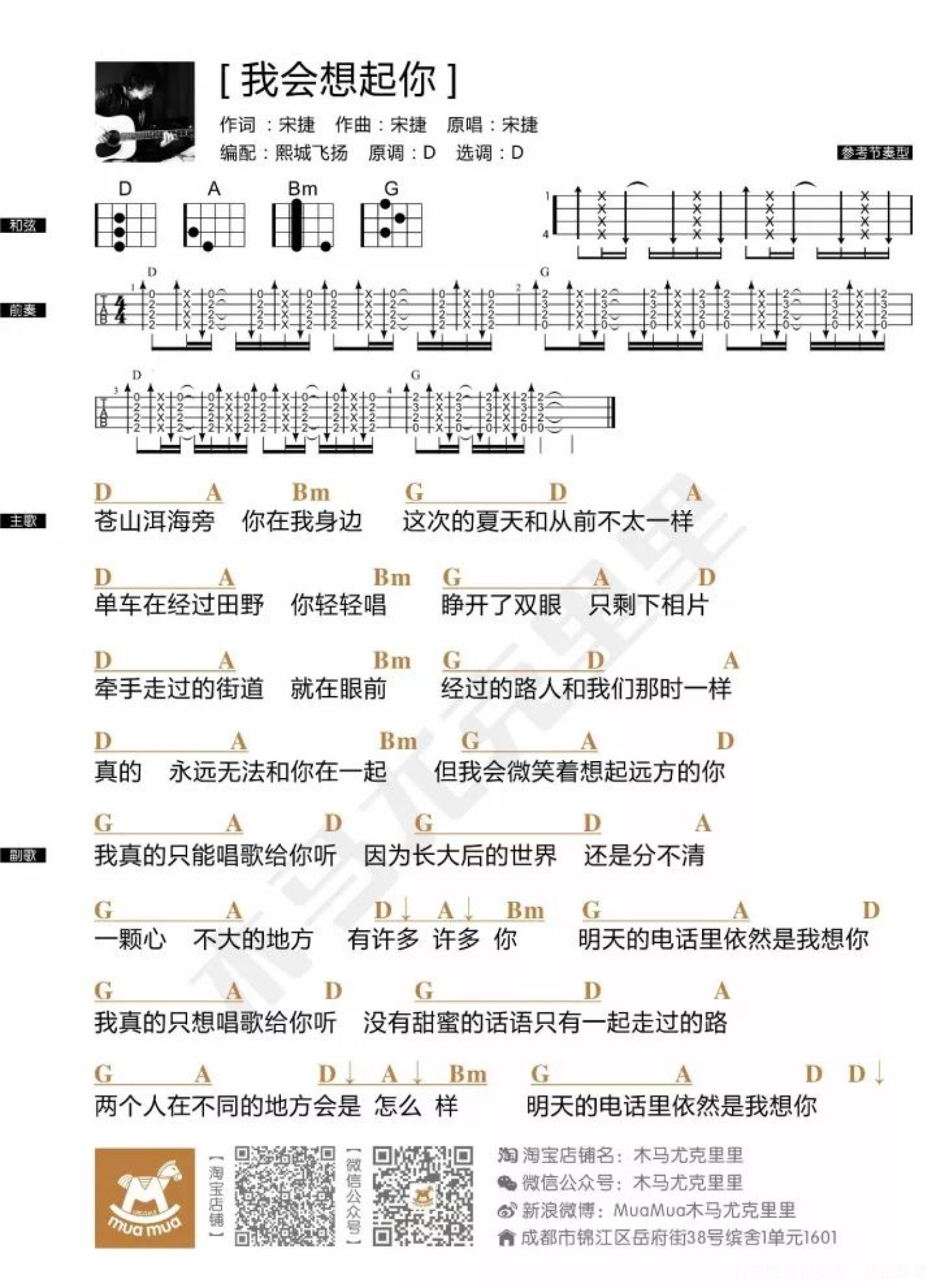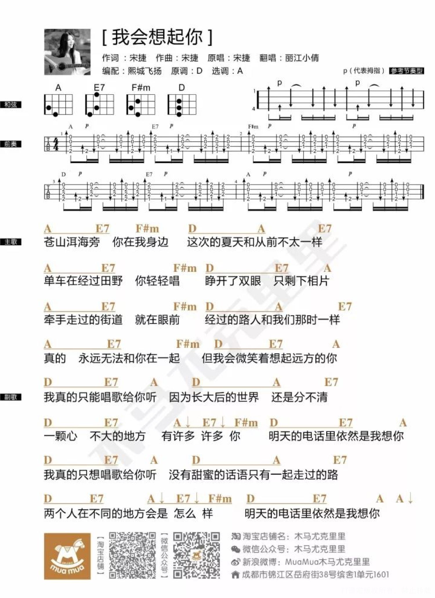 曲谱介绍: 今天和大家分享的尤克里里曲谱是来自于原迷玄乐队、病蛹乐队吉他手,现担任痛仰乐队吉他手宋捷原唱并词曲创作的民谣。宋捷凭借高大帅气的外形和干净的声音得到乐迷的喜爱。这首《我会想起你》还因为旅居丽江的丽江小倩(李倩)的翻唱而被国内更多人熟知。 大理在很多人心中是一个远离喧嚣的世外桃源,《我会想起你》正是描写了一个在苍山洱海边发生的爱情故事。宋捷以男主角的身份回到他和曾经的恋人一起去过的大理,看到熟悉的街道和田野,却已是物是人非的心情。宋捷的声音中没有刻意的花俏,却干净温暖得直击人心,“真的永远无法和你在一起,但我会微笑着想起远方的你。”这样对昔日爱人真挚的祝福配上简单轻快的吉他和弦,让伤感落幕的故事也充满了一点正能量。 关于编曲: 本首歌曲的男生调是D调,女生调是A调,男生版的前奏和伴奏型使用的“下 切上 上切上”,女生版使用的是“下 下上 上下上”,然后为了扫出层次,第二个下用拇指下打4弦,然后所有的上扫都是扫到下面三根琴弦。(两根也OK啦)     《我会想起你》UKULELE by Ivy小白兔 感谢Kawena品牌代言人,天鹅之星—— Ivy小白兔的演唱!好好听啊!好好听啊! (噢!小白兔由于声音比较高,所以琴是升了一个全音演唱的。)   男生版·曲谱下载   女生版·曲谱下载