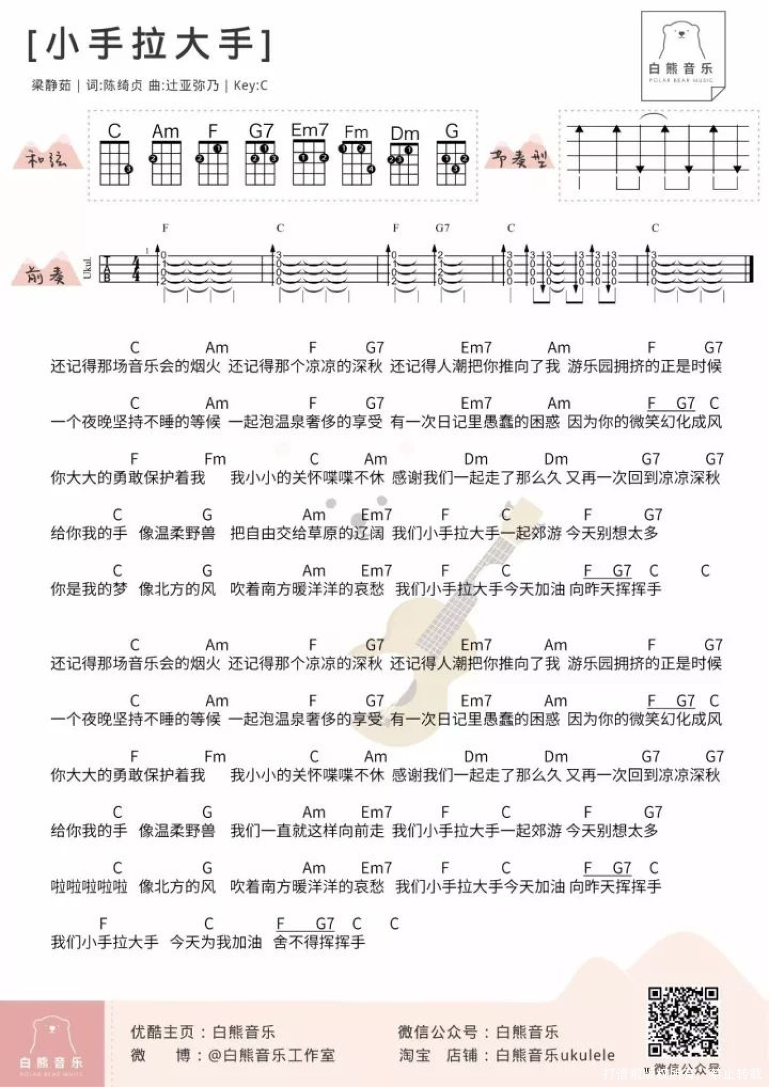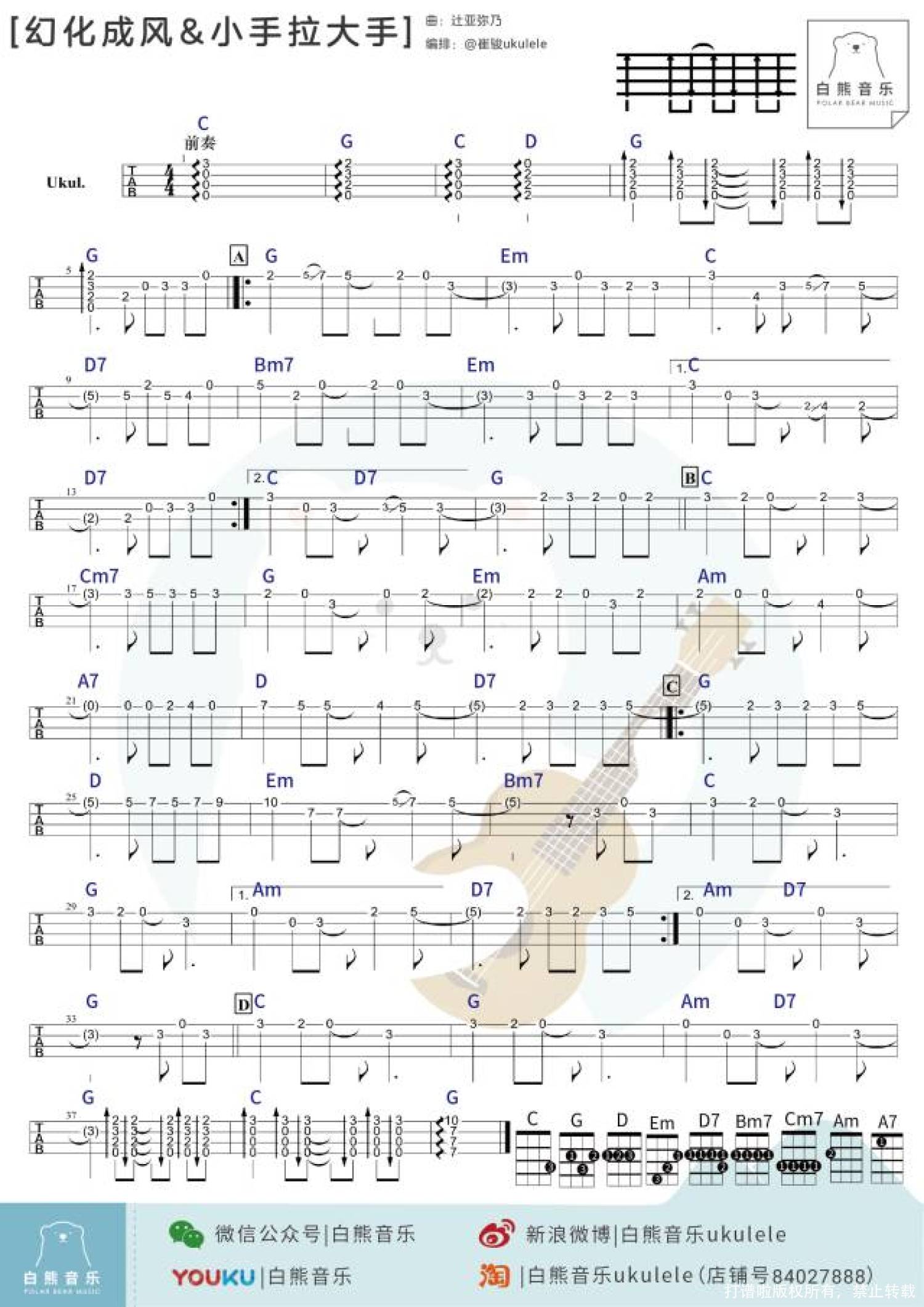 曲谱介绍: 几乎每个初学尤克里里的琴友 都必学的歌曲-〈小手拉大手〉 这次先分享指弹版本的曲谱与教学 弹唱教学之后也会有^^   猫的报恩 · 风になる   Ukulele指弹演示     ✚ 〈幻化成风〉是日本新生代音乐人辻亚弥乃的作品,被启用在日本吉卜力动画工作室出品,由铃木敏夫、高桥望担任监制,森田宏幸担当导演的动画电影《猫的报恩》的结尾曲。曲风朴素,轻松愉快,充满生机,令人心情舒畅。而电影动画中猫的生活时刻在提醒着我们社会上的每一个人,不要迷失自我,不要放弃梦想,也不要为了梦想放弃一切,坚信自己最初的梦想。 ✚ 有如春风化雨般的嗓音,为闷不透风的都市带来一丝清凉。つじあやの坚持自己平淡真挚的音乐风格,努力与JPOP及欧美的曲风保持距离。作品虽多为恋曲,却不甜腻与造作,唯有款款深情,静静地润人心田。“如果把我的音乐看成是电影,那么它们将绝不会是一部动作片,而会是一部缓和平淡的爱情片。其中包含着点滴的幸福与太多的酸楚。这正是我们日常生活的写照。而这也正是我想要的。” 辻亚弥乃一首接一首的唱着恋曲,带给听者以温柔的印象,但生活当中的她其实是一个充满干劲的活泼女孩。除了谱曲与作词,她还是一名弹奏ukulele的能手,在2008年甚至举行过名为“尤克里里教室”的巡回活动,为歌迷手把手教授ukulele。 ✚ 〈幻化成风〉被国内众多歌手重新演绎过,出现了多个中文作词版本。如:2002年曾宝仪的〈专注〉,2006年梁静茹的〈小手拉大手〉,及2012年陈星宇的〈单车之恋〉等。   Ukulele指弹教学   尤 克 里 里 谱 指弹(视频用谱)   弹唱谱