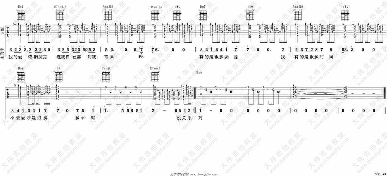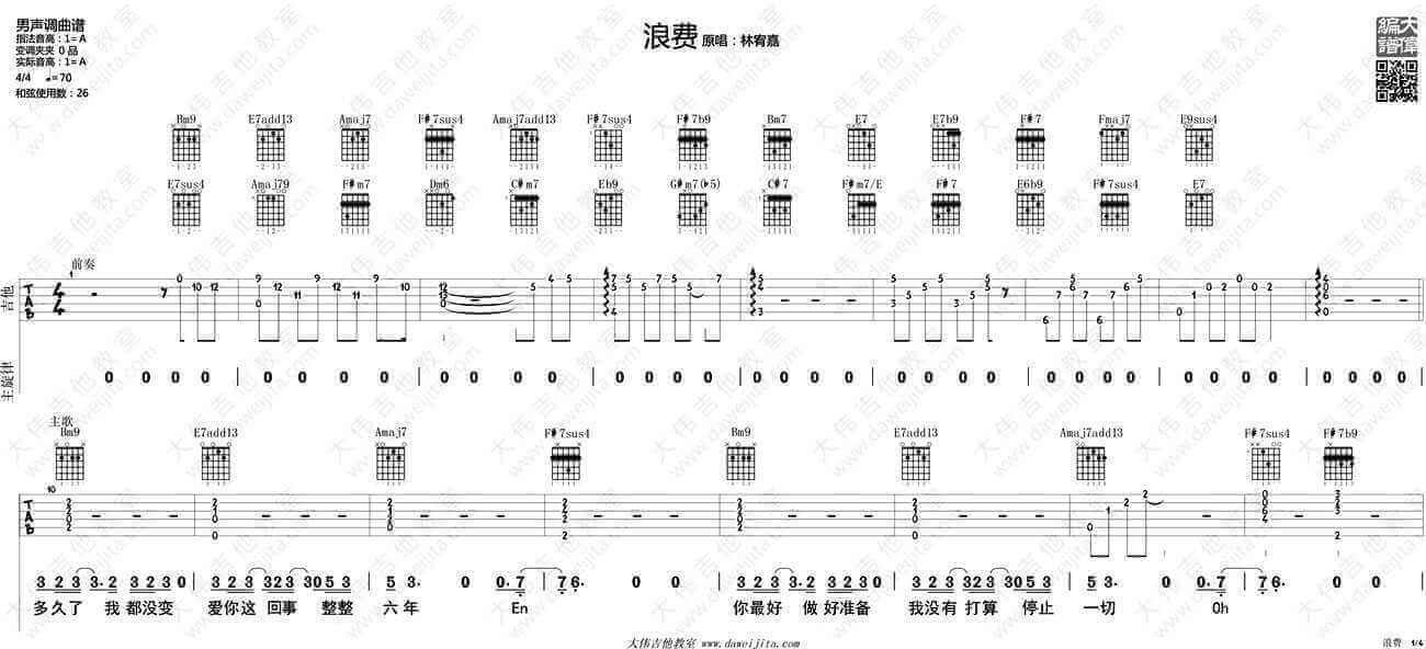 曲谱介绍: 林宥嘉浪费吉他谱,男生版A调指法,浪费吉他六线谱,四张图片谱例。每一个青涩的青春都配得上一段曾经奋不顾身的爱情,也许只是痴迷的片刻,也许便是执着的一生。一首歌,唱出一段酸楚亦或清纯的感情。林宥嘉的《浪费》吉他弹唱教学,大伟吉他版权所有。