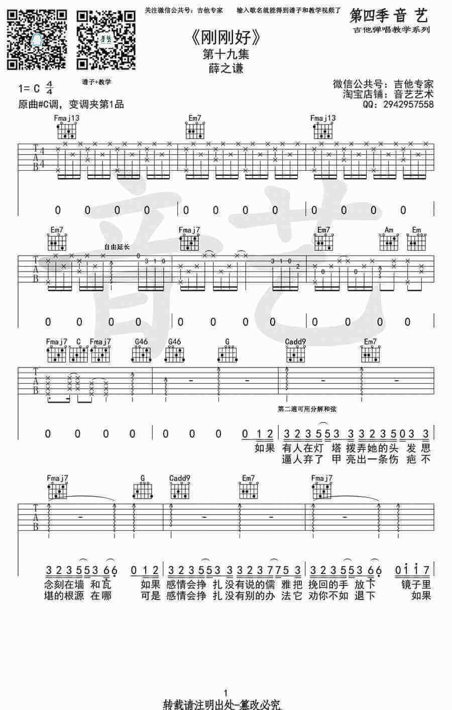 曲谱介绍: 薛之谦刚刚好吉他谱,原曲#C调,变调夹夹一品,C调指法编配。刚刚好吉他六线谱,三张图片谱。典型的薛式情歌的编曲与唱腔,《刚刚好》弹唱谱,网红逗逼段子手演绎的苦情歌,安静的旋律刚刚好还是那么戳心。
