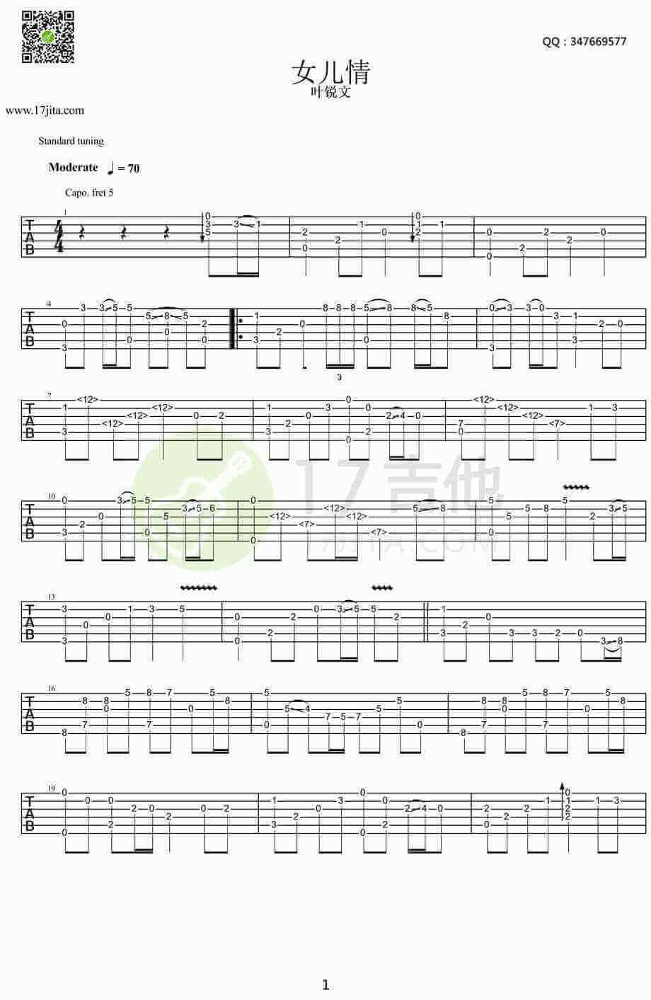 女儿情吉他谱 - 吉他独奏谱