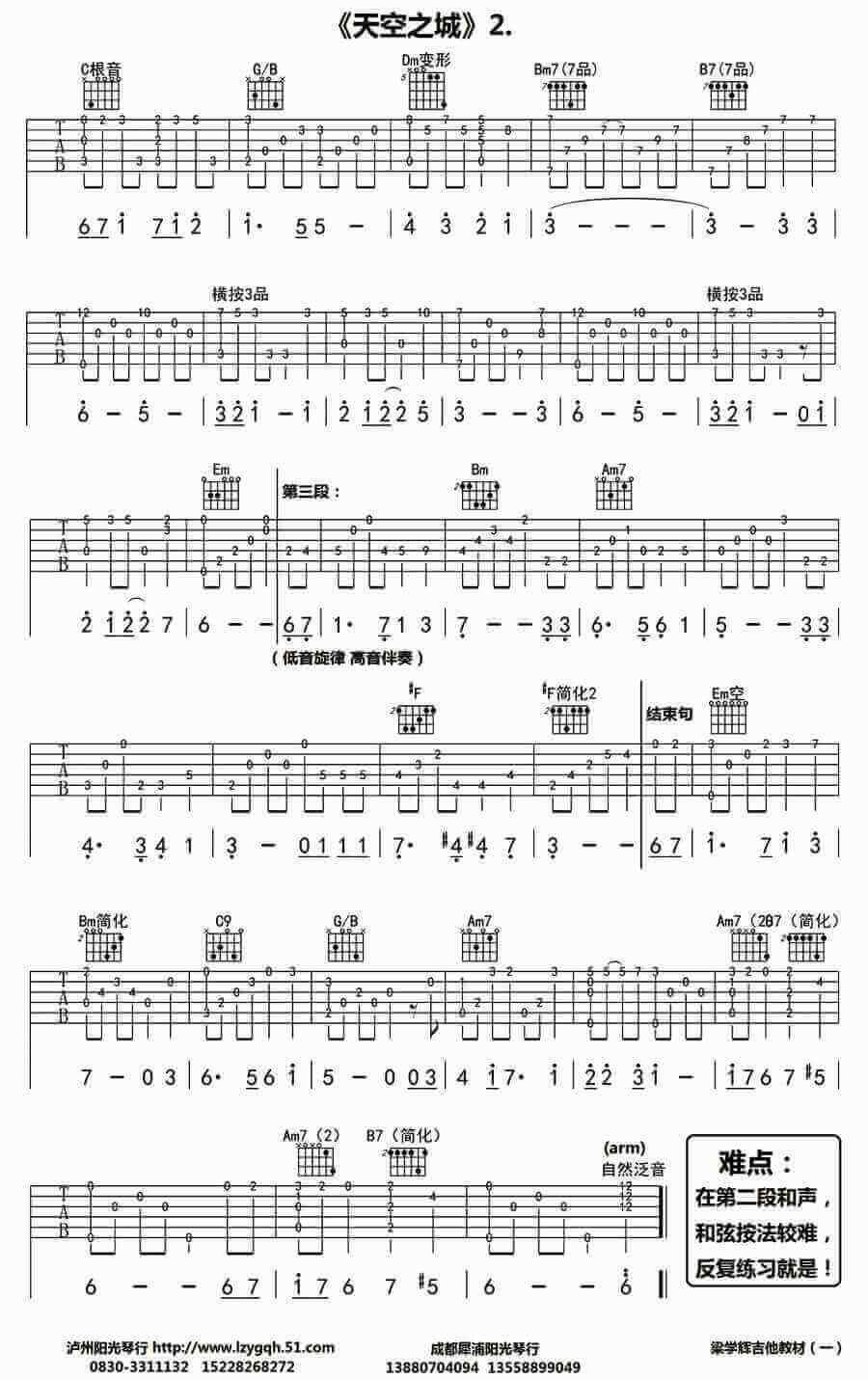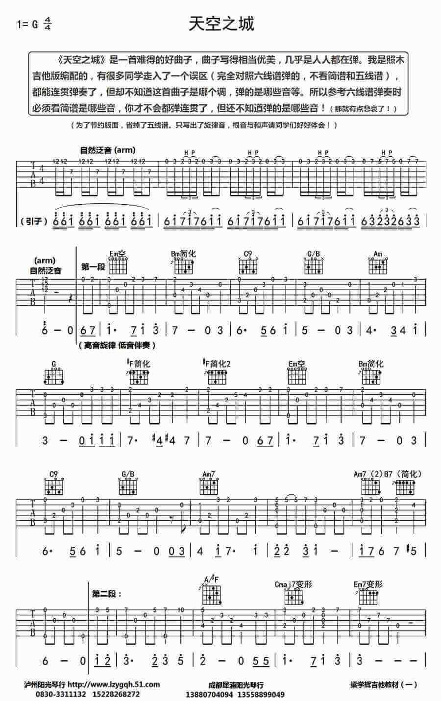 曲谱介绍: 天空之城吉他指弹谱,一首经典的旋律,曲子优美动听,琴友们基本都曾经弹过吧。编者梁学辉老师是依照木吉他版本编配。 天空之城 由音乐家久石让作曲,因以其让人落泪的优美曲调和动人心弦的美妙音律而闻名全球,被改编成多种版本,成为经典的轻音乐名曲,也成为流芳百世的世界名曲。