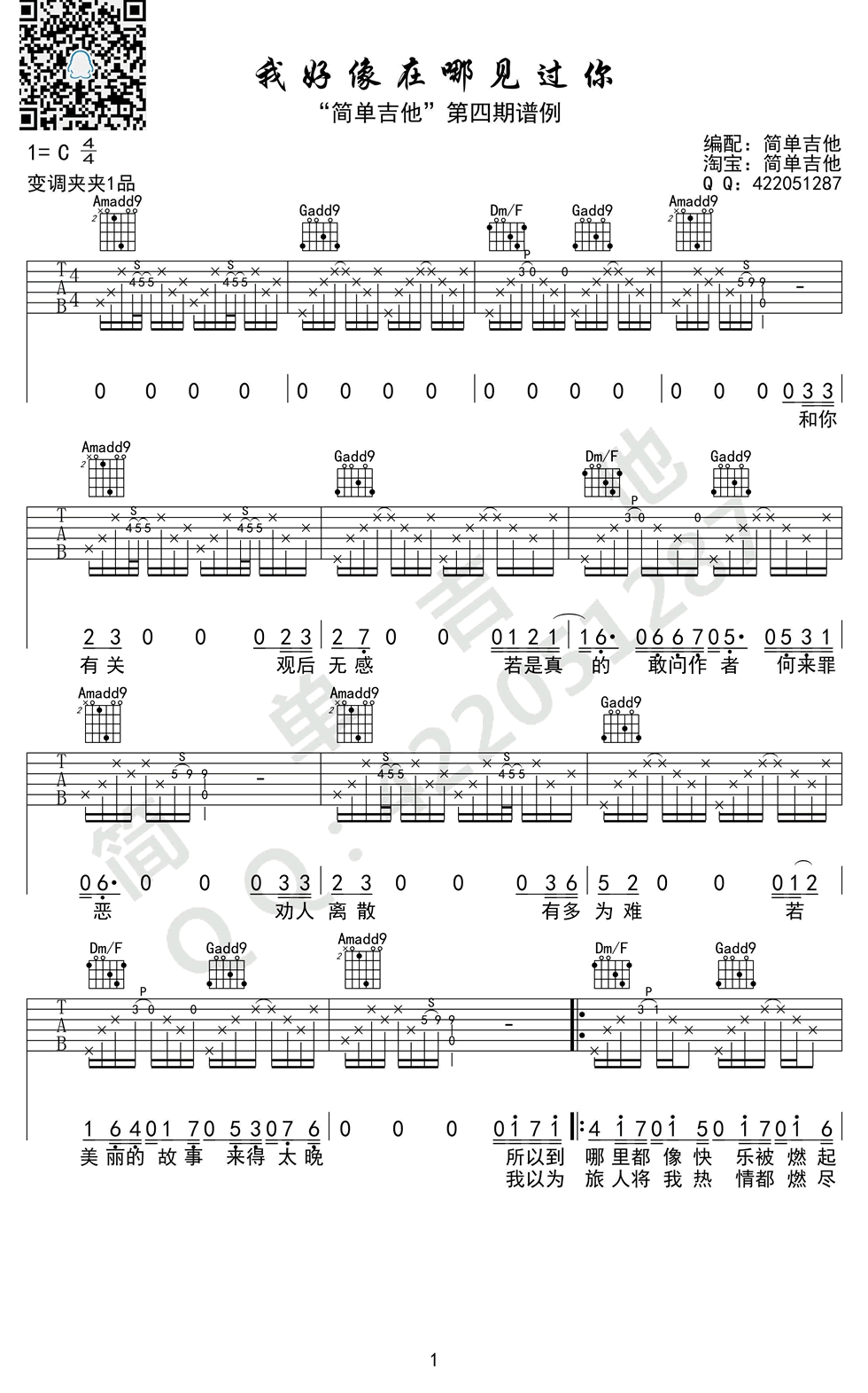 曲谱介绍: 薛之谦演唱,我好像在哪见过你吉他谱,C调,简单吉他编配,变调夹夹一品,薛之谦《我好像在哪见过你》吉他谱,高清图片谱。歌曲的音符缓缓揭开一段尘封爱情故事的序幕,让人看见更加广角的成熟男人的内心风景,歌词想说的是柏拉图式爱情。