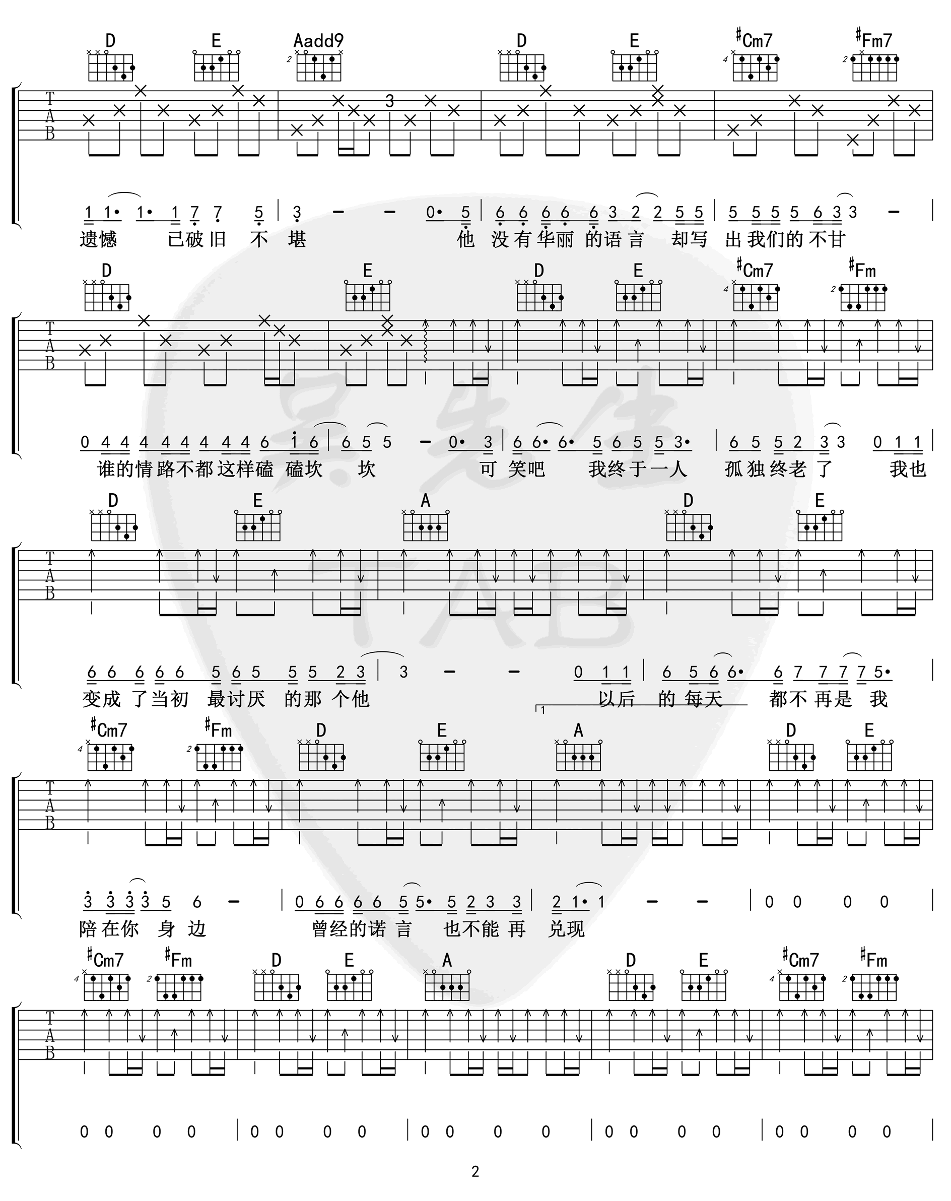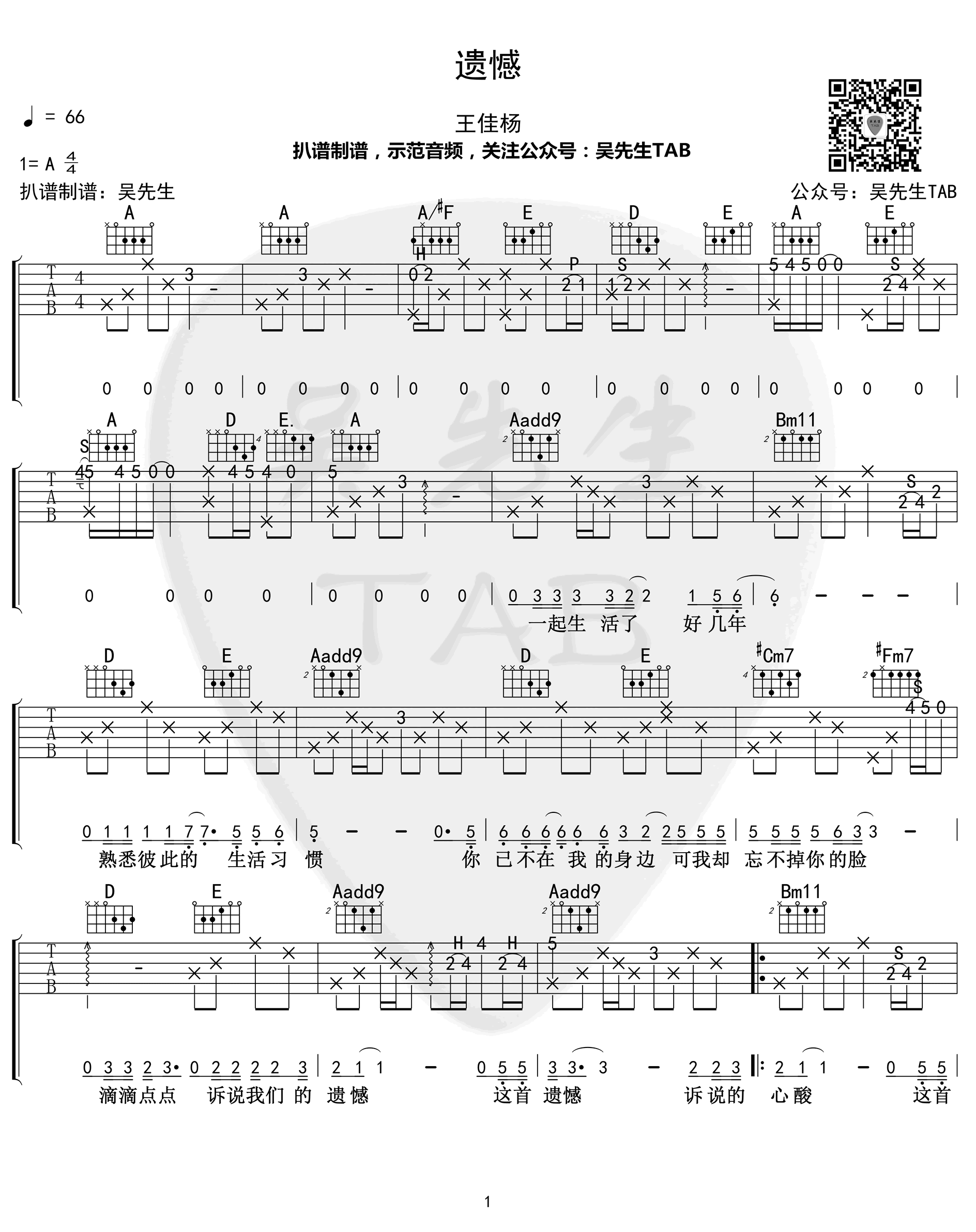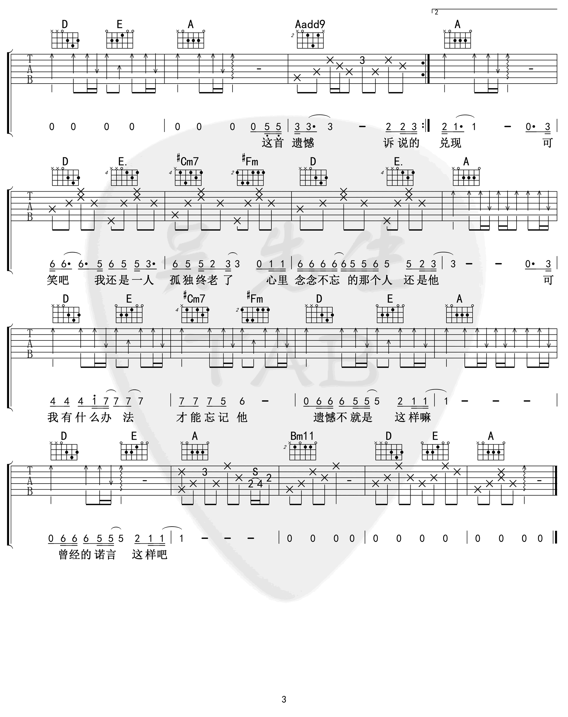 曲谱介绍: 《遗憾》吉他谱,王佳杨(是你大哥阿)词曲创作演唱,A调原版编配,遗憾六线谱,三张高清弹唱图片谱,吴先生扒谱出品,吉他源整理上传。