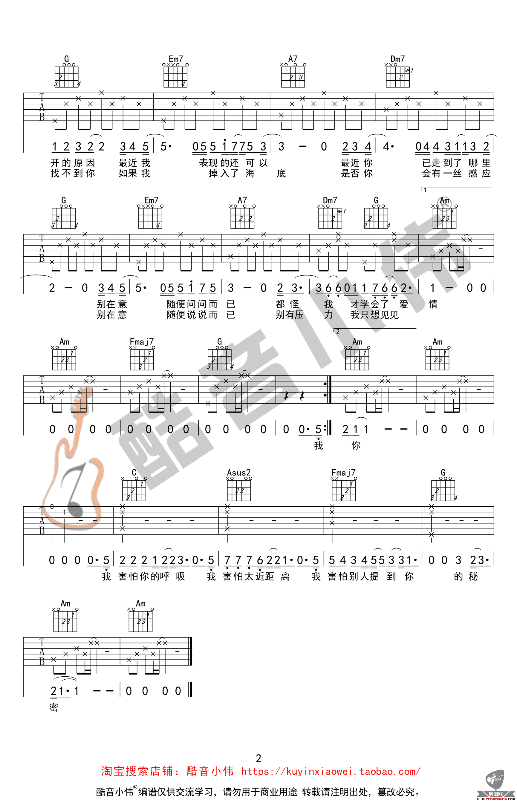 曲谱介绍: 薛之谦《我害怕》吉他谱,C调简单版,男生0-4品。我害怕吉他弹唱谱,高清弹唱谱,两张图片谱,酷音小伟编配。
