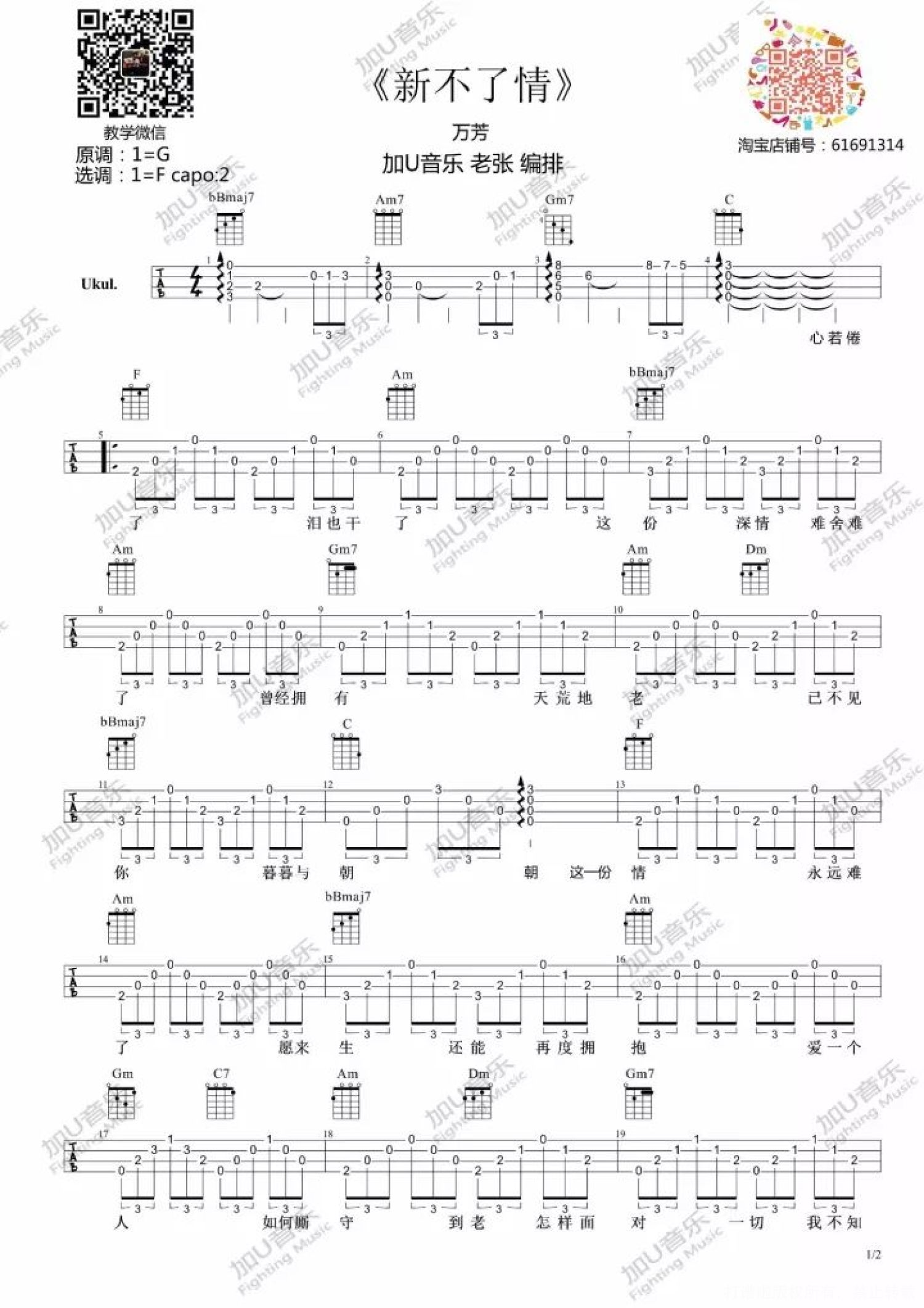 曲谱介绍: 如果哪天有(dan)空(teng) 排列个翻唱榜TOP10 《新不了情》绝对是其中的爆款 翻唱的歌手不计其数 包括老张 经典曲目永远都是辣么经久耐听 无论是 浴室中的歌神上身、 KTV里技压群雄的麦霸、 还是 失恋后掩饰眼泪的悲痛嘶喊... 不分场合 绝对是 宣泄情感和拼炫唱功的 必备曲目 本期我们也来撸一把   Ukulele Cover   《新不了情》尤克里里曲谱