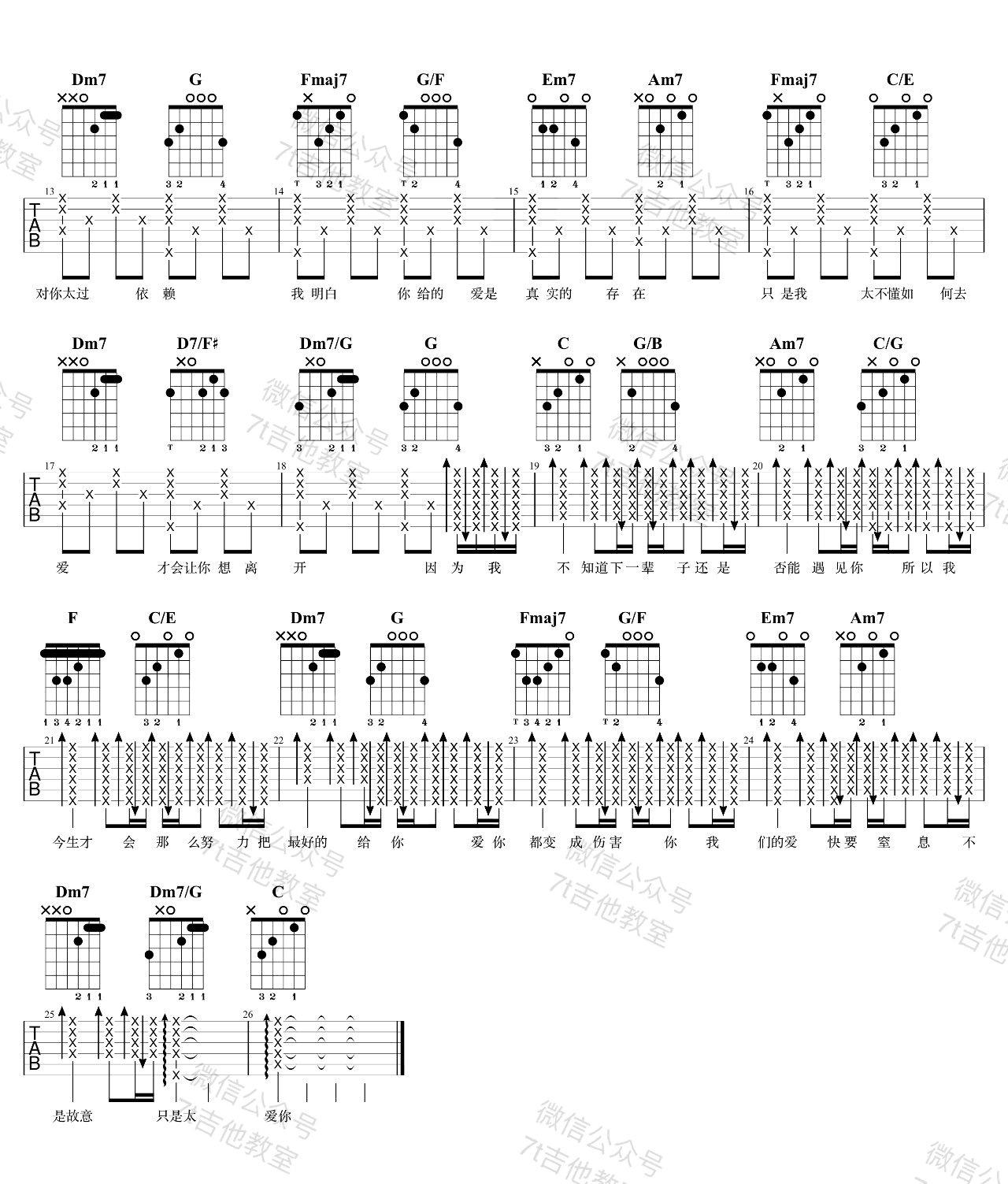 曲谱介绍: 只是太爱你吉他谱,张敬轩演唱的一首动听情歌,《比悲伤更悲伤的故事》电影片尾曲,歌曲原调升A大调,选用了C调指法编配,只是太爱你六线谱,7t吉他教室编配出品。随谱附上弹唱示范视频。 吉他弹唱演示及视频教学