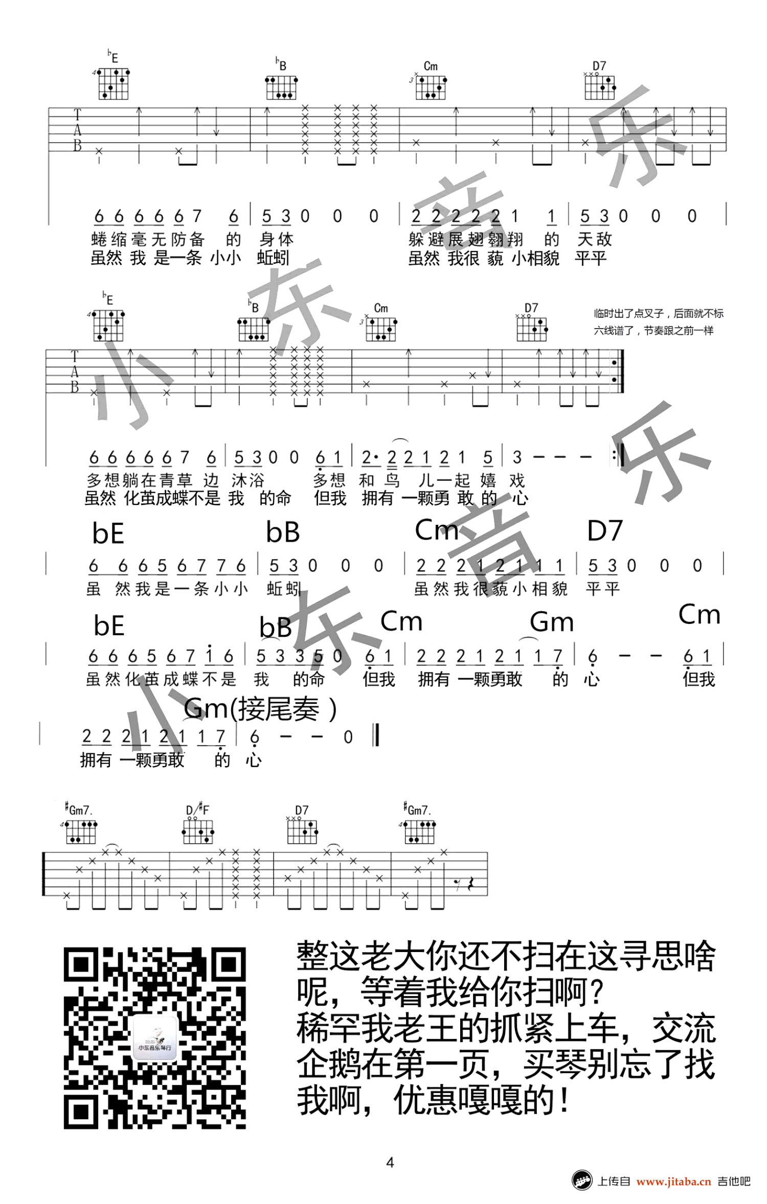 曲谱介绍: 杨紫《蚯蚓》吉他谱,原版弹唱谱编配,电视剧《欢乐颂》插曲,该曲由著名音乐人董冬冬作曲、陈曦作词,清新的旋律优美动听,柔情如夕阳暖意流淌心底,活泼又似朝阳光芒四射,将剧中人物邱莹莹化为歌名,透过形象的歌词和杨紫演绎,将人物个性在歌中展露无余。杨紫蚯蚓六线谱,专属于邱莹莹的《欢乐颂》第二季电视剧插曲。虽然我很渺小相貌平平,虽然化茧成蝶不是我的命-这说的不就是偶吗,唯一不同的是我没有一颗勇敢的心。