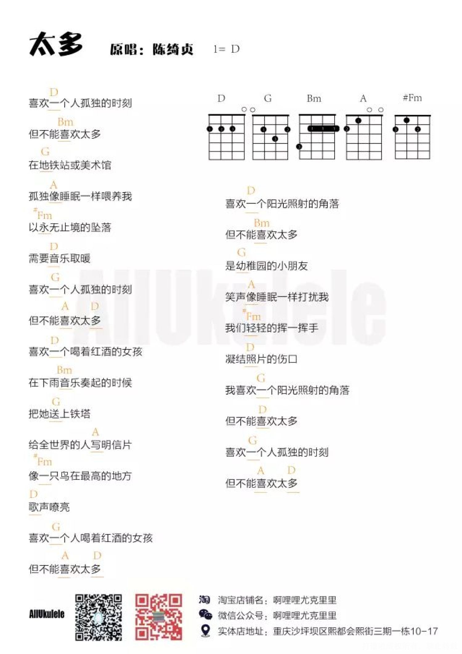 曲谱介绍: 她 是在学校里坐你隔壁的那个女孩。 有着对生活对爱情的烦恼, 也有着小女孩的可爱淘气; Cheer——陈绮贞, 我们的陈老师.   陈绮贞(Cheer),1975年6月6日出生于台湾省台北市,中国台湾民谣女歌手、作词人、作曲人、演员,毕业于政治大学 妥妥的哲学系才女哇! 讲真,从零几年的《西风的话》到现在火到爆的《我喜欢上你的内心活动》。陈老师的歌可谓是充满了我的整个学生时代! 陪我走过了无数个春夏秋冬的上学清晨.... “喜欢一个人孤独的时刻,但不能喜欢太多.....” 陈老师说:“我没有要传达什么,我只是要抚平自己来回的深层的恐惧,和极度的愉悦。在那样的界限里面,我想让自己看到,喔~原来这段时间,我的转变就是像这张唱片这样子。” “我就是那种,我不喜欢做这件事情,也没有办法有人可以逼我做这件事情,所以我的结论就是,反正我就是做我高兴的事,最好这些事还能够支持我过日子,还可以生存。”她就那样平静地说出了我梦寐以求的生活状态。 于是我变成了一个“脑残粉..” 当然 我最期待的还是之后能去现场听她唱歌 去见一见这位有思想、有感情、充满生命力的女生:) —— Nicole 尤克里里演示   太多 尤克里里谱 分享一段Cheer在小黑板上的话 我特别喜欢!