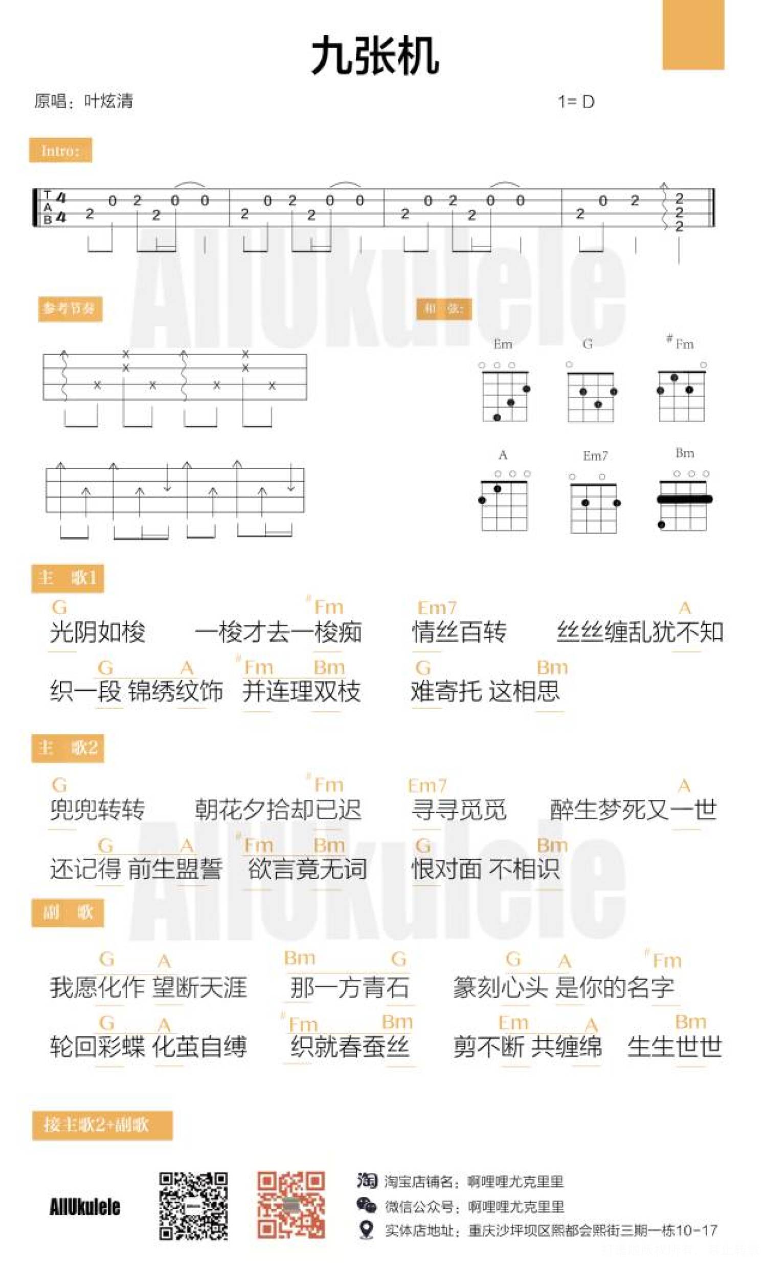 曲谱介绍: Aloha 大家下午好....今天啊哩哩给小伙伴们分享的是叶炫清的《九张机》。《九张机》是《双世宠妃》的主题曲,由叶炫清演唱,这部剧由超高人气小说《爆笑宠妃》改编,由元德执导,杨十夜编剧,赵洁、杨朔担任总制片人,张志炜、李阳担任制片人,大胆启用新人演员,共同演绎了一部腹黑欢喜冤家的爱情故事。 《双世宠妃》打破以往甜爱玛丽苏剧的单线套路,在剧情设定中,不再傻白甜的女主曲檀儿与男主墨连城相爱后,成为一对精明腹黑的欢喜夫妻,在携手面对争储危机时默契十足,所向披靡。 叶炫清嗓音足够有层次感,能够唱出这首歌背后重重叠叠的故事。听见这首歌,会顿生穿越之感,会想起西子湖畔的苏小小和李书生;会想起金殿之前为玉环招魂的唐明皇,回想起桃花扇中血溅飞花的李香君,会想起几世情缘的痴男怨女。那样绝世的情愫大凡属于古代,那个白衣翩翩、言笑晏晏的水墨画里,有女思春,有士多情,有将为国死,有君为民亡。那个为爱舍生忘死,为义肝胆相照的时代,因为至纯,至烈,所以成为绝唱。   《九张机》ukulele教学     《九张机》ukulele谱