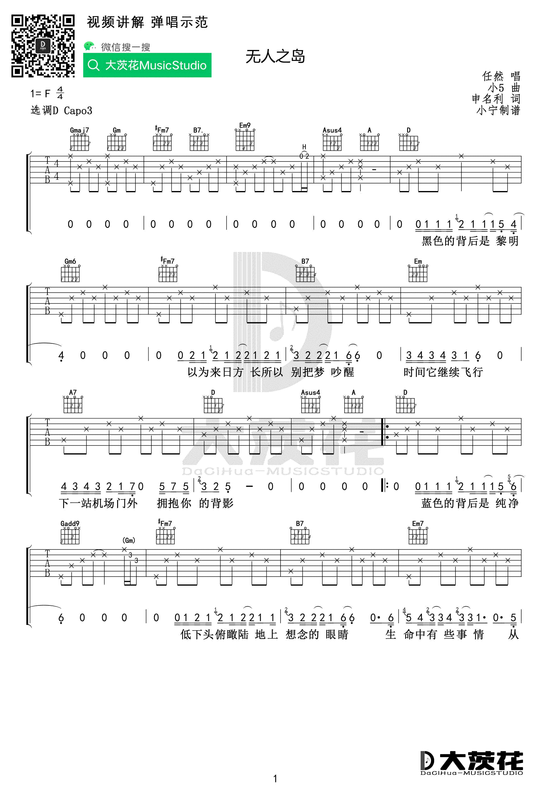 曲谱介绍: 无人之岛吉他谱,任然演唱,一首爱而不得表达思念的歌。原调F,选调D,变调夹三品。无人之岛六线谱,两张弹唱图片谱,大茨花编配出品。