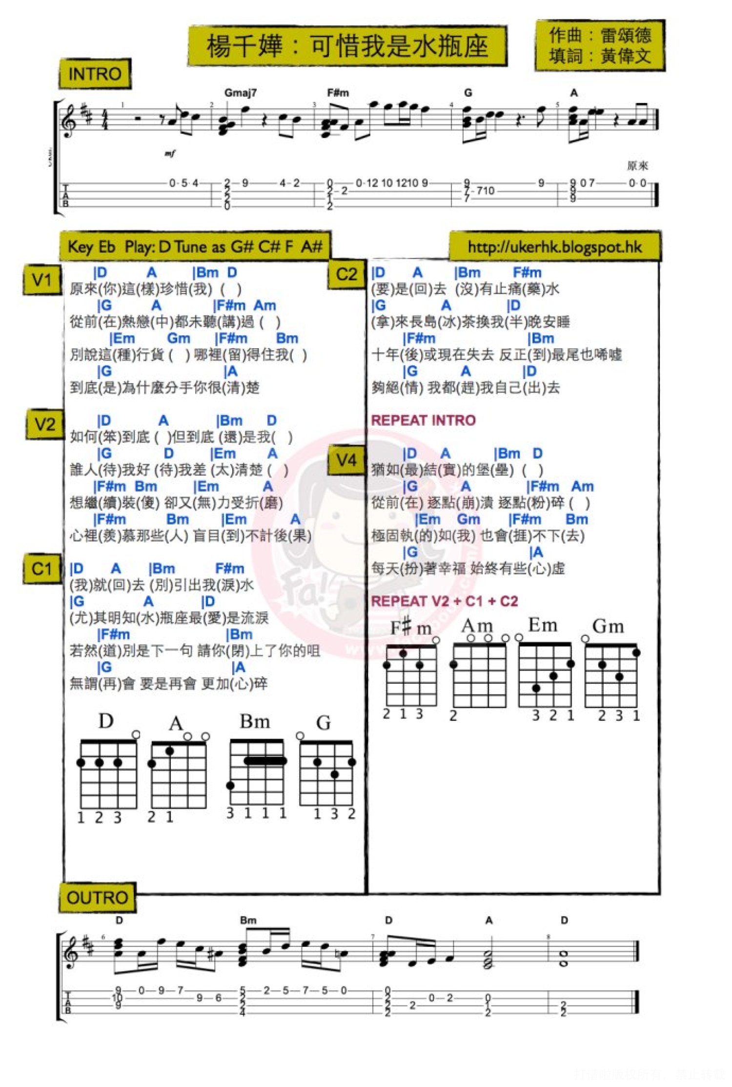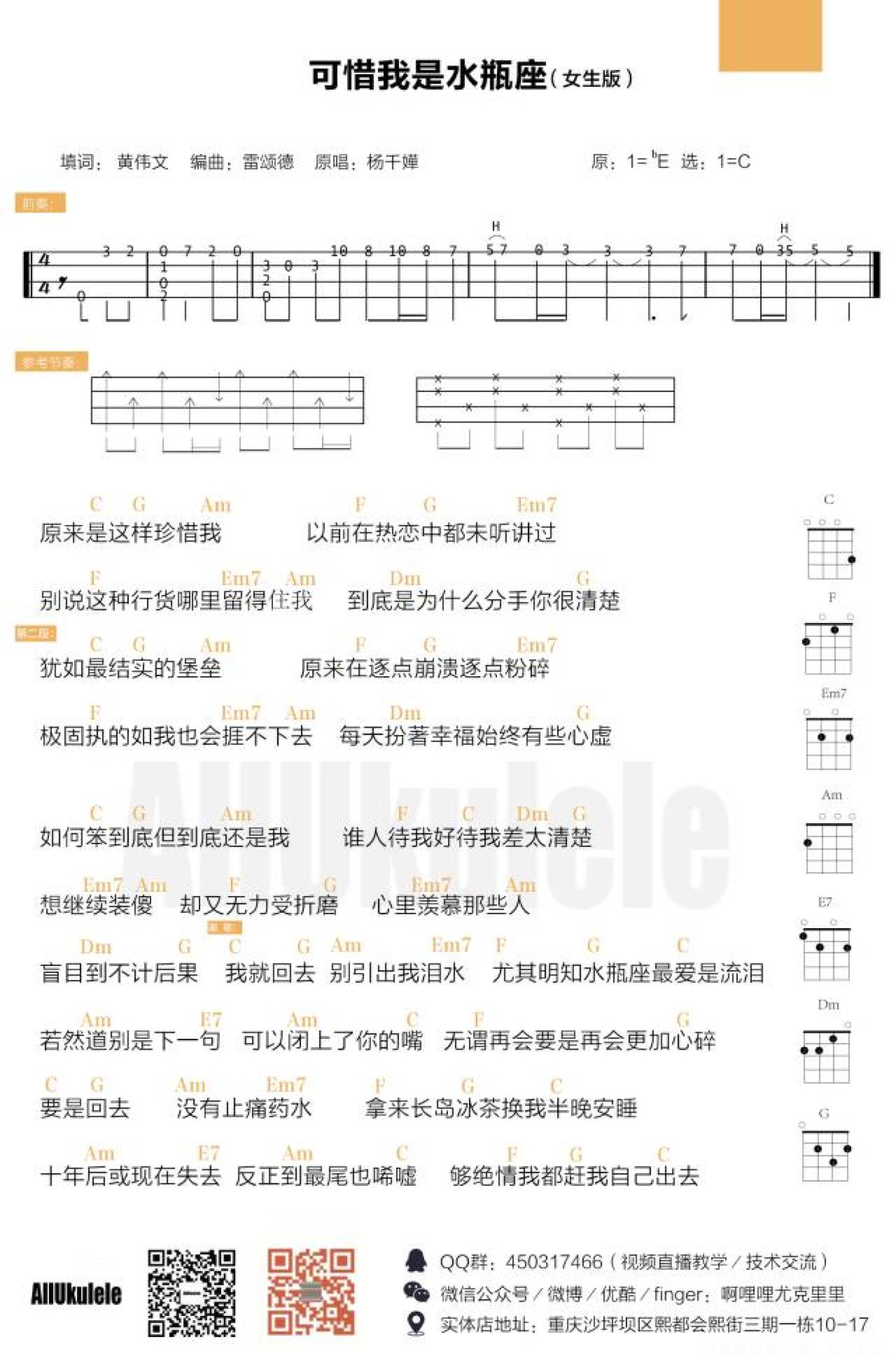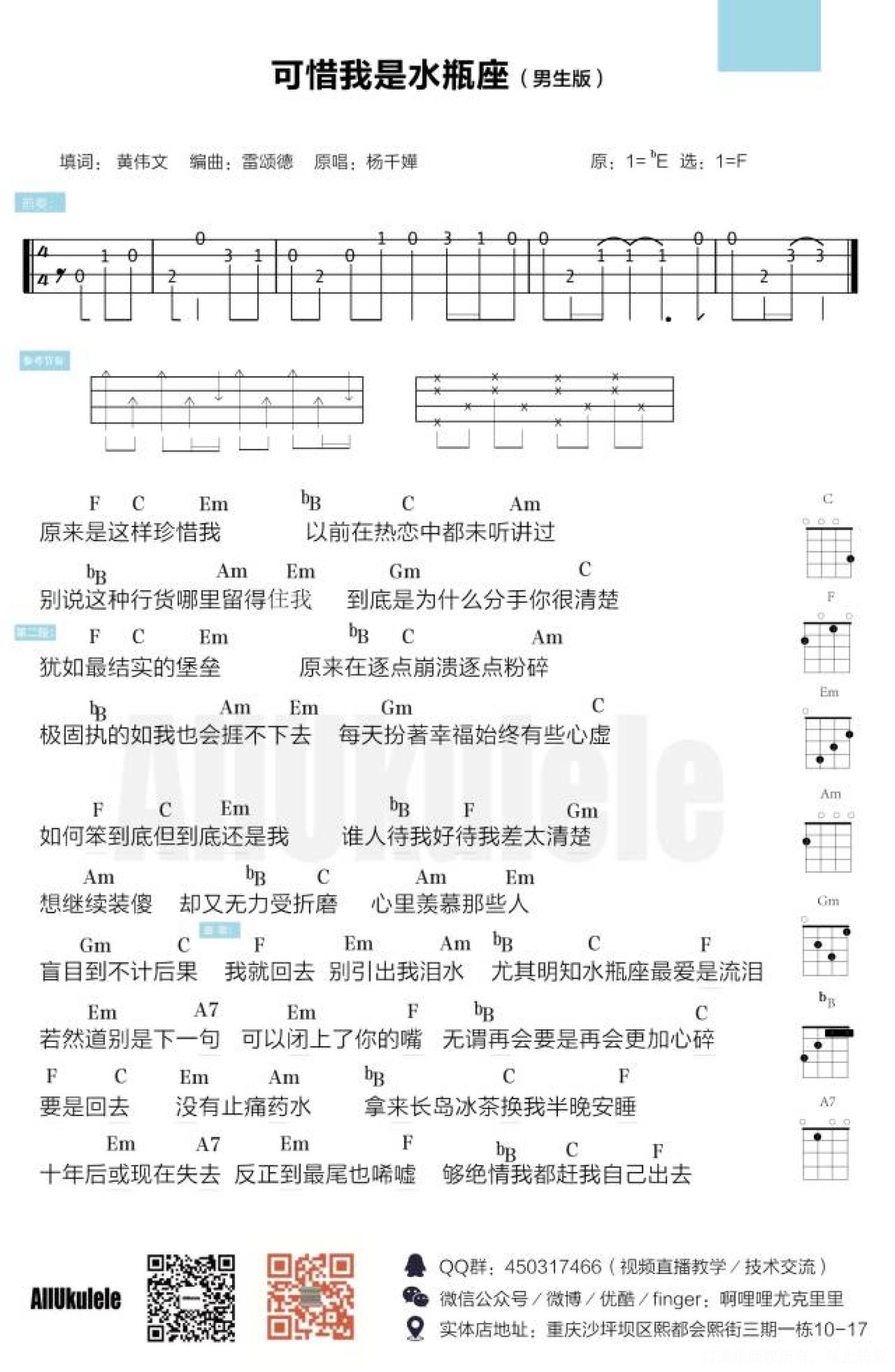 曲谱介绍: Aloha 大家晚上好!今天给大家分享一首好听的老歌——杨千嬅的《可惜我是水瓶座》(可惜我不是水瓶座哈哈哈..)这首歌发行于2002年11月22日。是当年的劲歌金曲第一季季选得奖歌曲,并获得了香港第26届十大中文金曲奖第一名,新城劲爆歌曲奖,十大劲歌金曲奖。(反正小编对粤语歌是没有一点点抵抗力的!) 那这首《可惜我是水瓶座》呢,是由黄伟文作词,雷德颂作曲,雷颂德、Ted Lo(罗尚正)编曲,杨千嬅演唱,最早收录于专辑《Miriam's Music Box》中,发行于2002年11月22日——   《可惜我是水瓶座》ukulele谱   女生版 男生版   带前奏版