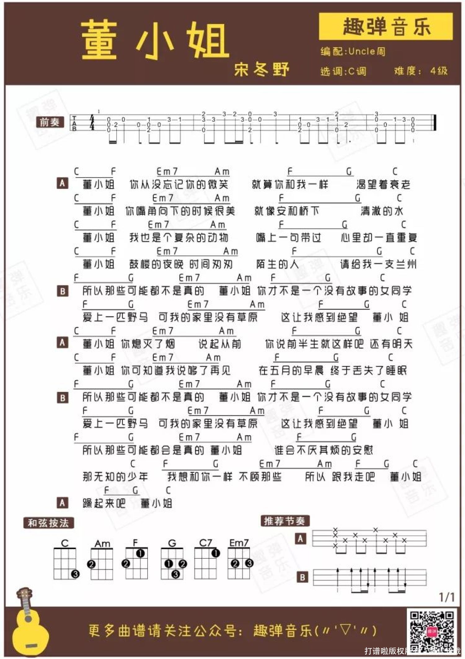 曲谱介绍: Aloha~ 细心的小伙伴一定发现了今天标题的不同之处~首先允许民谣狗们欢呼3分钟! 没错,从下周开始,每周三我们都会在这个全新栏目里约!民!谣! 那么第一期,就先来给大家介绍一位民谣界最红最有故事的girl——《董小姐》。   2013年,民谣歌手宋冬野的一首《董小姐》成为文艺青年必备、表白示爱必会的歌曲。 胖子总是深情的,几乎所有人认为宋冬野是因为喜欢董小姐写了这首歌。 无数人被歌词打动,泪流满面地抄进了小本本里。   然而宋冬野耿直得像个200多斤的大胖子。一次采访中,他说……   “你们都误解了这首歌。 董小姐是我认识的一个老师。 我只是在替她记录她的故事。 野马啊草原的那句歌词, 也是你们想多了, 我就这么随便一说……”     说者无意,听者有心。民谣的特点之一,就是每个人都能在其中找到自己的故事。 暂时忘记歌词,一起在小U清亮又不失深情的旋律里重温一遍《董小姐》吧~   指弹演示   //吉他伴奏下载 大家练熟歌曲之后,就可以跟着吉他伴奏练习 百度网盘:http://pan.baidu.com/s/1nuZZ5TB   关于歌曲 ● 由宋冬野作词、作曲,收录在2012年12月发行的专辑《摩登天空7》中。 ● 歌曲在一选秀节目中被翻唱后蹿红,从小众音乐走进大家的视野。 《董小姐》是一首简单的歌,歌词和旋律都很简单,几乎所有人听了几遍以后就能挂在嘴边唱了。 也许是被现实虐惨了,所以这样安静简单的音乐越来越能给人们内心的脆弱以安慰。   指弹曲谱   附送:弹唱曲谱