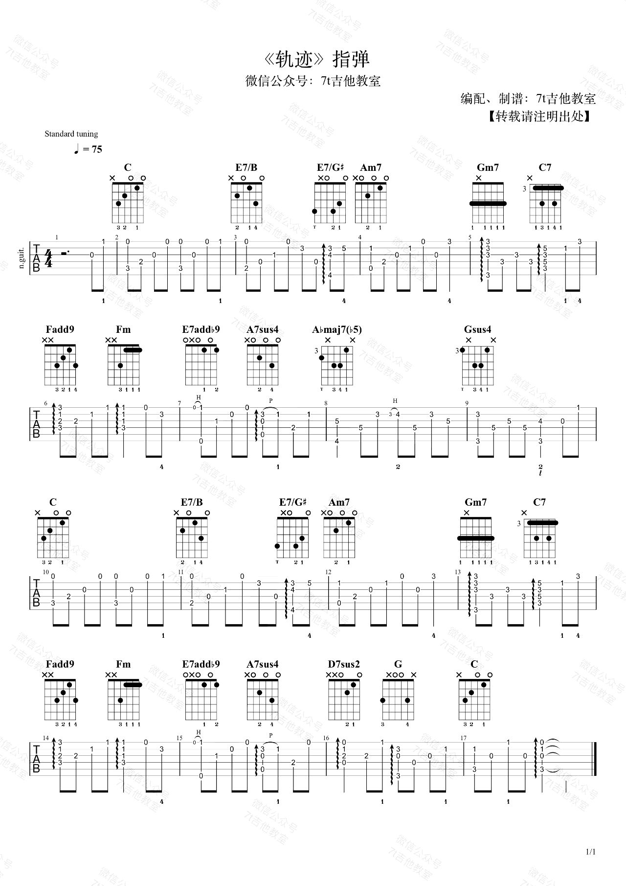 曲谱介绍: 吉他弹唱演示及视频教学 《轨迹》指弹吉他谱,周杰伦演唱歌曲改编,轨迹吉他独奏谱,这首歌用了C大调的指法来编配,难度不算太大,7T吉他教室出品。 谱子上标记了左手指法,时值符号下方的数字表示左手用拿个手指来按相应的位置,1为食指,2为中指,3为无名指,4为小拇指,T为拇指,谱子上的左手指法是我比较推荐的,大家可以参考一下,如果自己觉得其它指法更适合自己也是没问题的哦~
