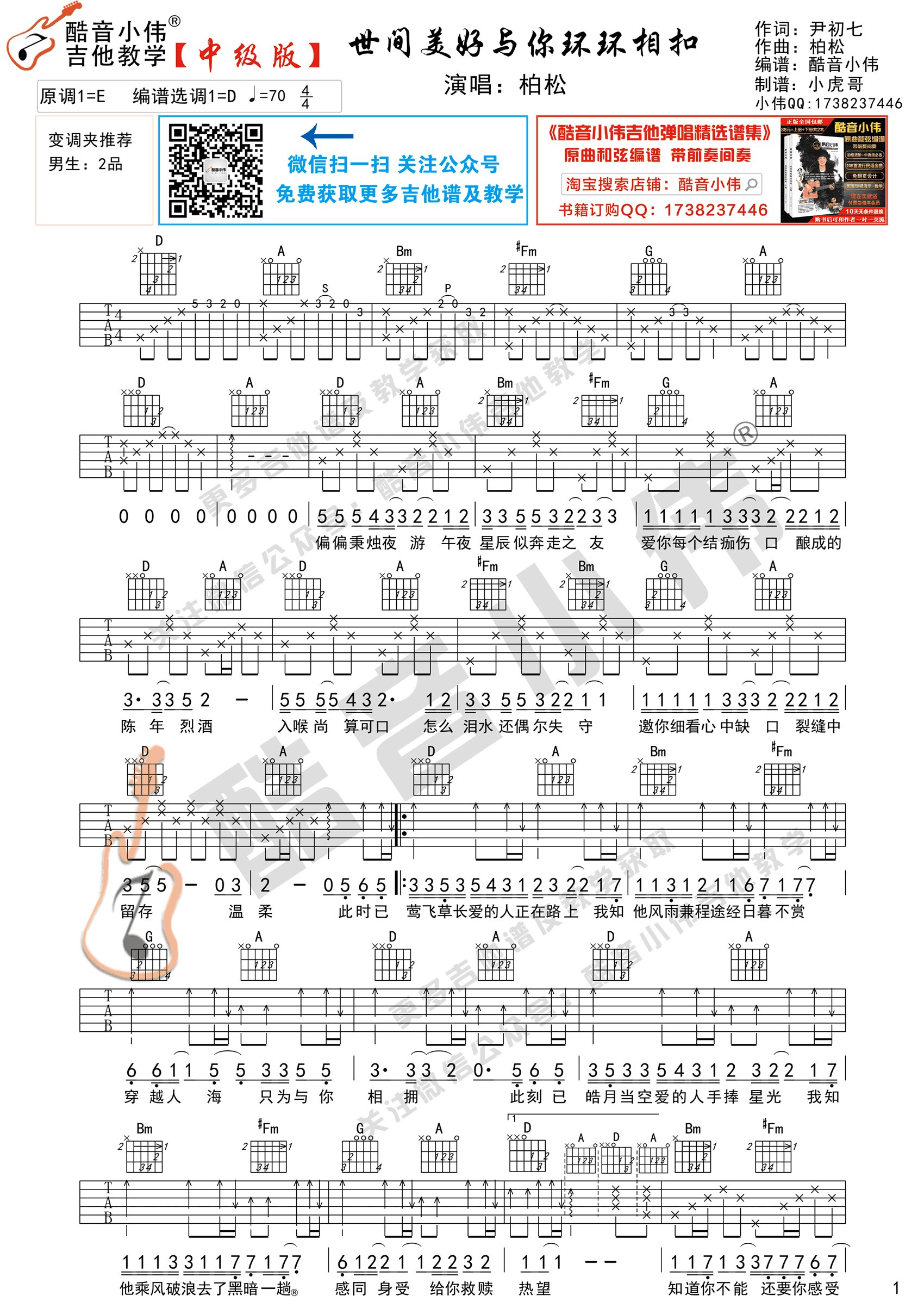 曲谱介绍: 吉他弹唱演示及视频教学 世间美好与你环环相扣吉他谱,柏松的一首热门民谣歌曲,最近火遍网络各大平台。世间美好与你环环相扣吉他弹唱六线谱,原调E,选用D调,变调夹推荐,男生2品,酷音小伟编配版本,吉他源吉他谱上传分享。 随谱附上曲谱配套的吉他演示和教学视频,同学们可以跟随老师的讲解示范练习。如果觉得中级版有难度,也可以参考为大家准备的吉他谱简单版。曲谱已经放在页面下方。