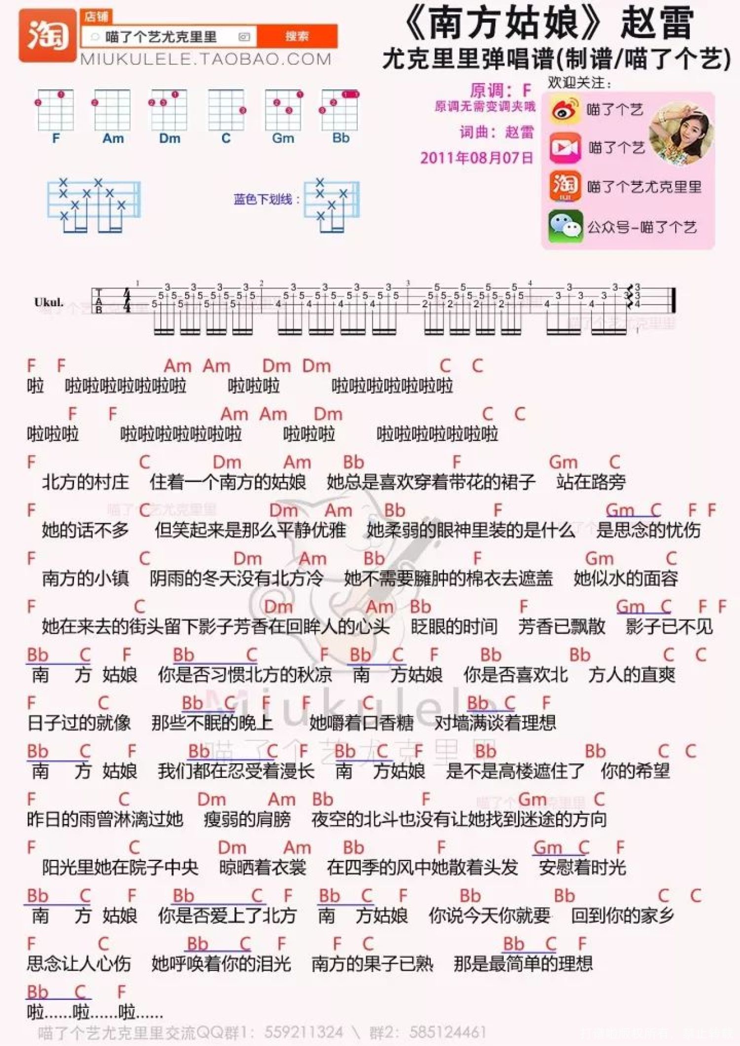 曲谱介绍: 《南方姑娘》尤克里里曲谱