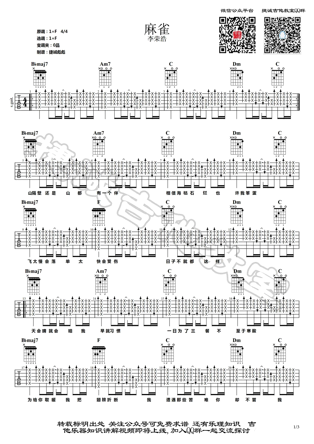曲谱介绍: 麻雀吉他谱,李荣浩演唱的新歌,F调和弦扫弦版编配,麻雀吉他弹唱谱,三张图片六线谱。捷诚吉他教室出品,吉他源整理上传。随谱附上吉他教学视频。 李荣浩的这首励志歌曲,没有华丽的词藻,也没有激进的高音,一切从心里而来,唱出每一个平凡人生的渺小和顽强,在经历波折起落后,依然会努力顽强的迎接每一个明天。 吉他弹唱演示及视频教学