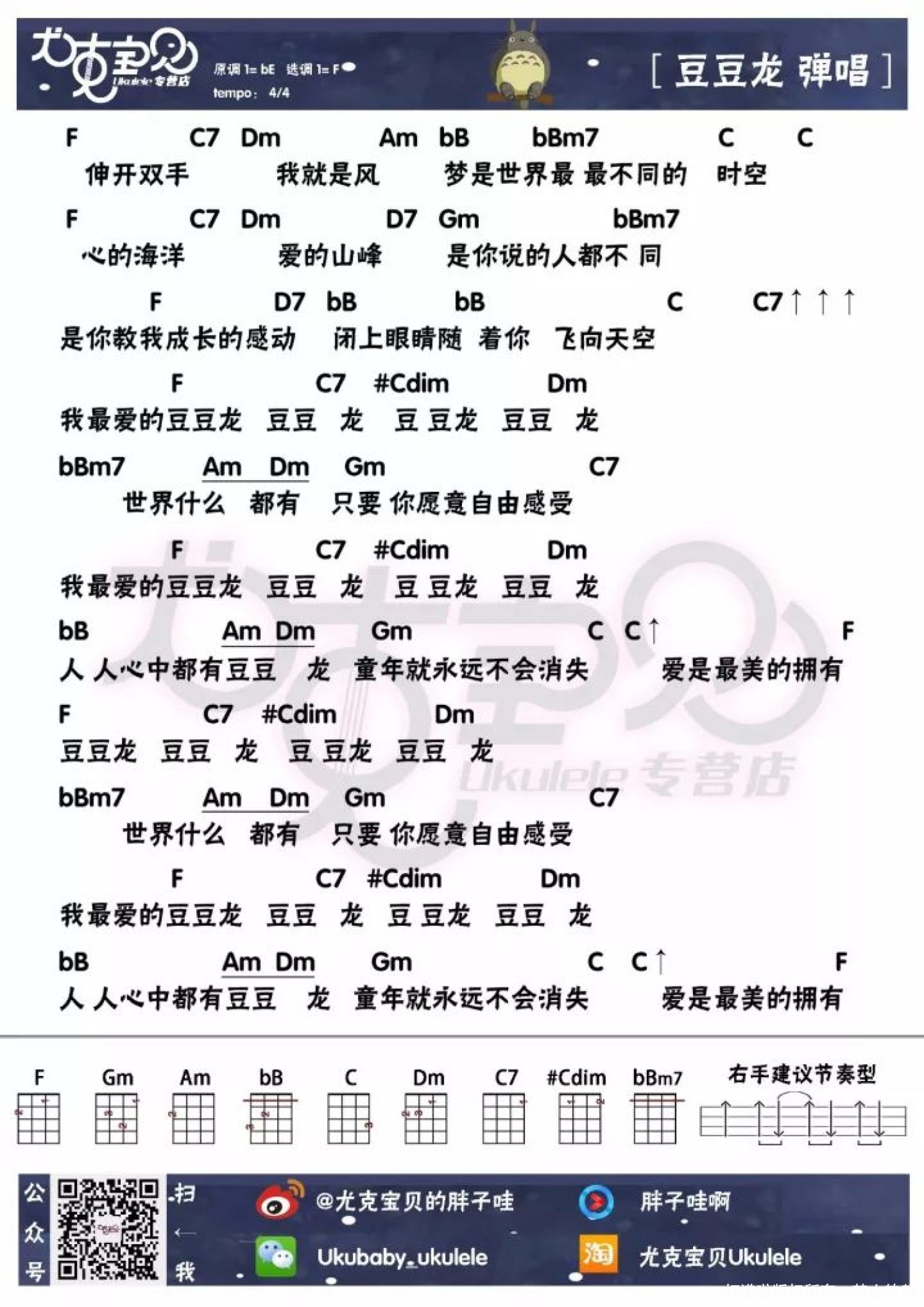 曲谱介绍: TOTOROとなりのトトロ:龙猫 「!となりのトトロ」,是日本知名动画导演宫崎骏于1988年推出的动画片《龙猫》的片尾曲,由宫崎骏作词,久石让作曲,日版由井上杏美(井上あずみ)演唱,中文版为《豆豆龙》,范晓萱演唱的歌曲,被收录于其专辑《小魔女的魔法书》中。 「!となりのトトロ」,是日本知名动画导演宫崎骏于1988年推出的动画片《龙猫》的片尾曲,由宫崎骏作词,久石让作曲,中文版为《豆豆龙》,范晓萱演唱。   Ukulele弹唱曲谱 Ukulele指弹版本  cover 胖子哇   Ukulele指弹曲谱