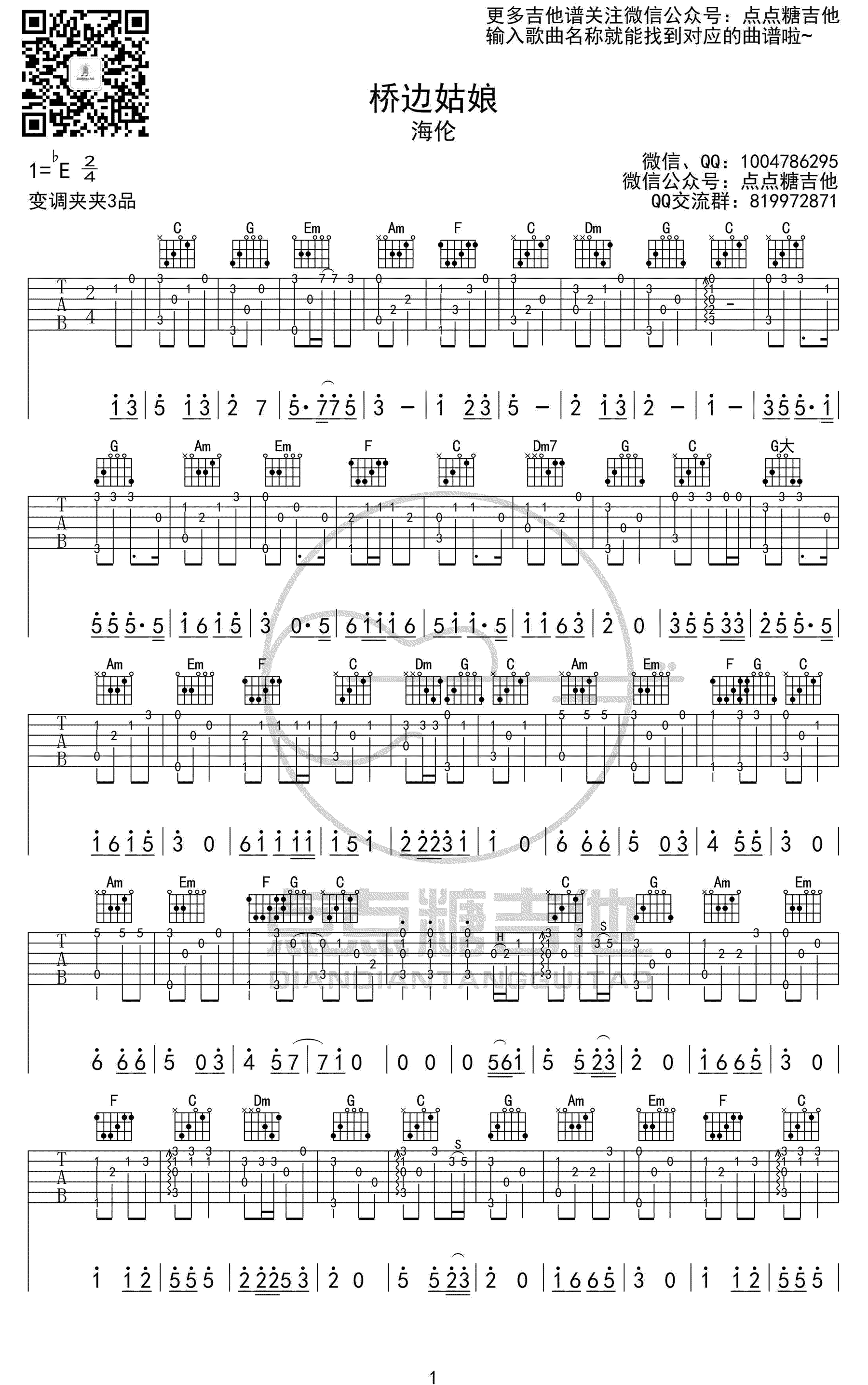 曲谱介绍: 吉他弹唱演示及视频教学 桥边姑娘指弹谱,海伦的网络热门歌曲改编,桥边姑娘吉他独奏谱,原调是bE调,选用的是C调指法编配,变调夹三品。感谢点点糖吉他制谱分享,吉他源整理上传。 编配提示:和声走向大致都是“卡农和弦”,过渡段和尾奏一样,都是6-3-45-1。原版第一遍唱完后还有一段大反复省略掉了,琴友们要和原版一样的话自行反复就可以。主歌过渡到副歌时有三拍是C和弦的顿音,上面有标注一个小圆点,弹的时候要迅速把音制住。 老师在演奏时即兴加入了一些过渡音,谱子上没有完全写下来,大家可以观看演奏视频,然后再结合谱例学习会更加明白。
