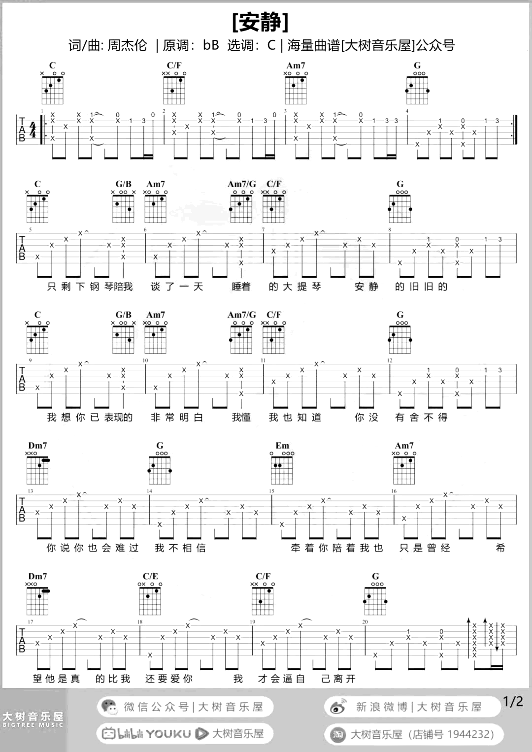安静吉他谱 - 周杰伦 - C调吉他弹唱谱