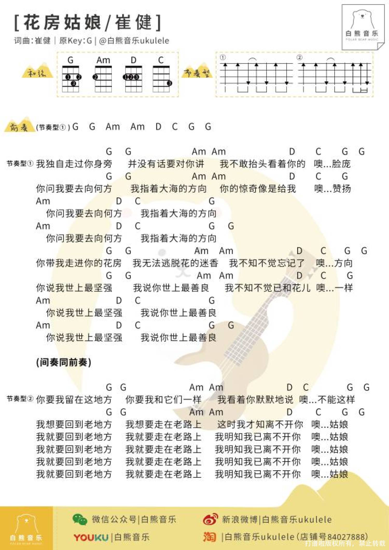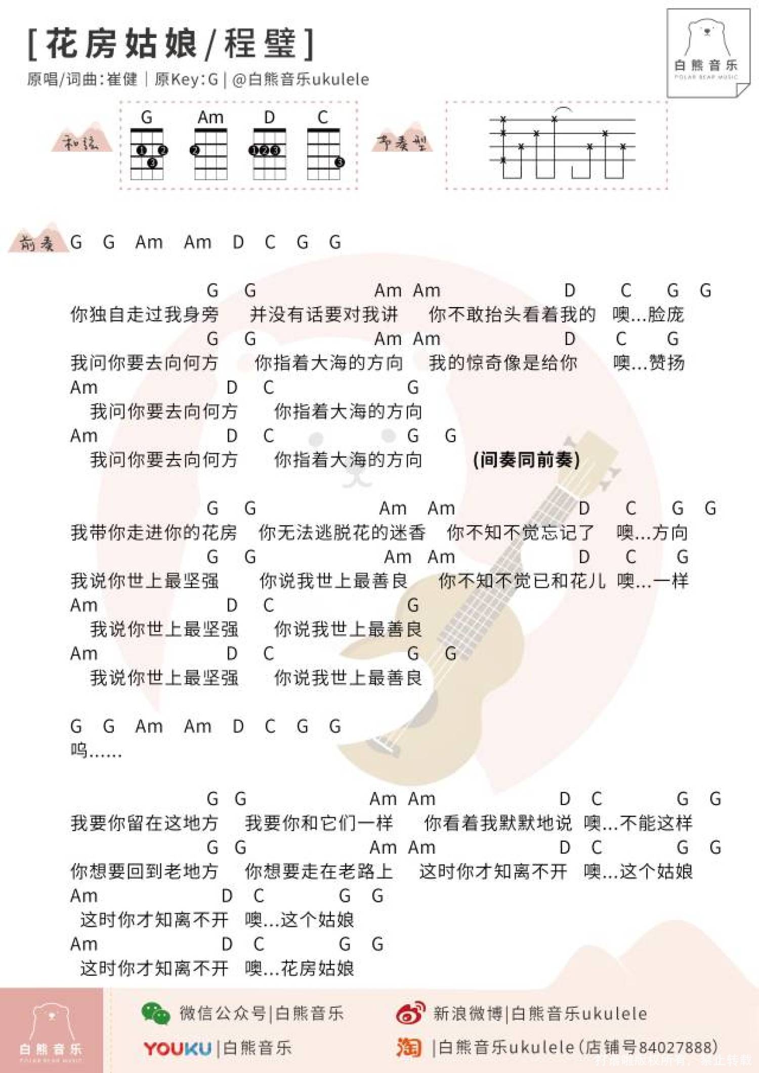 曲谱介绍: 在崔健的所有歌曲中,〈花房姑娘〉称得上是最抒情的一首。比起他的那些怒吼式的歌曲来,〈花房姑娘〉中多了一点柔情的东西。正是这一点点柔情,透露出了1980年代青春情感生活的冰山一角; 在处理柔情的方面,20世纪80年代的艺术普遍面临考验。〈花房姑娘〉中的情爱体验,看上去是一种粗野与温情、狂躁与哀伤的奇妙的混合物。真挚而又强烈的情感与压抑的文化环境和笨拙的表达方式,造成了歌曲中诸情绪元素之间的极度不协和的关系。从嘶哑的歌声中,可以听出一种内在的紧张感和撕裂感。这是20世纪80年代的愤怒的青年的声嘶力竭的声音和他们情感饥渴和焦虑的证明;   〈花房姑娘〉程璧演唱的歌曲。此歌由程璧经过改变一小部分歌词后,以“花房姑娘”的视角进行演唱,与原版较为粗犷的风格相比,显得轻灵悠扬,被网友称为“离诗歌最近的声音”。     花房姑娘尤克里里谱 女声版 男声版