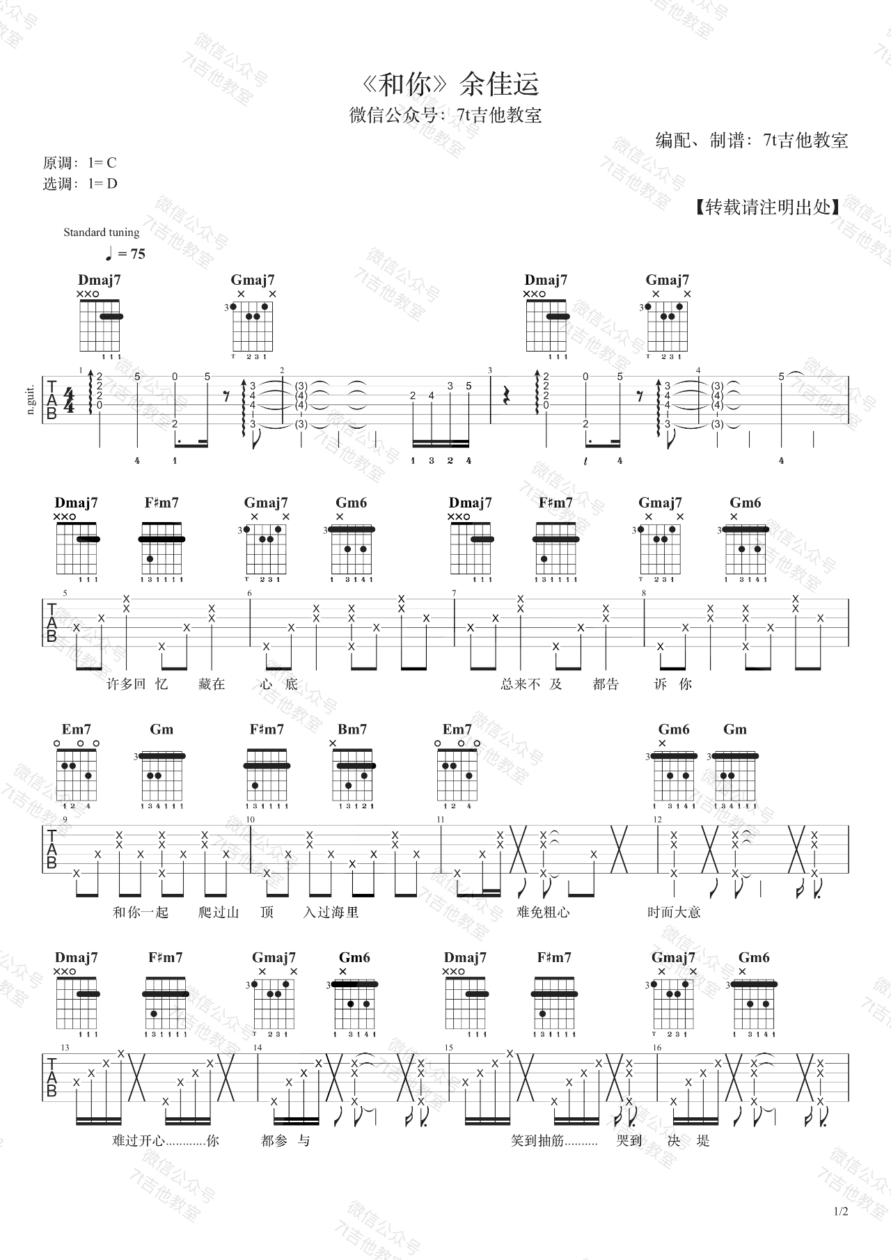 曲谱介绍: 余佳运《和你》吉他谱,这首歌的原调是C大调,用D大调的指法来编配,变调夹夹在第3品。男生的话建议降半音调弦或者降全音调弦,不夹变调夹~ 右手节奏型方面大家可以自由发挥,7T吉他教室编配出品,琴谱网上传更新。 这是唱作音乐人余佳运的“幸福三部曲”之一,一首《和你》唱出了爱情里许多美好的事,让我们回忆一段过往,那个凉爽的夏天,有道不尽再见的毕业,有轻柔的晚风,有白衬衫,碎花裙,和你。