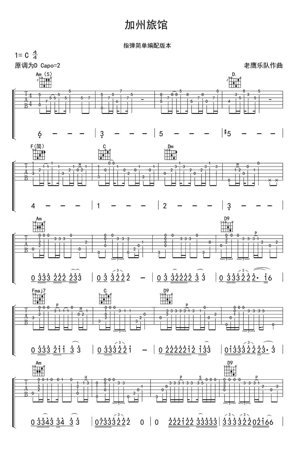 曲谱介绍: 加州旅馆指弹吉他谱,老鹰乐队经典歌曲改编,Hotel California吉他独奏谱,指弹简单编配版本,易 唱网更新上传。 一首风靡世界的乐曲,是Eagles巅峰之作,其乐曲的知名成都甚至超过乐队本身。乐曲一经推出,引得无数人为之痴迷,各种版本层出不穷。吉他版本听着又是不一样的味道,经典值得回味。