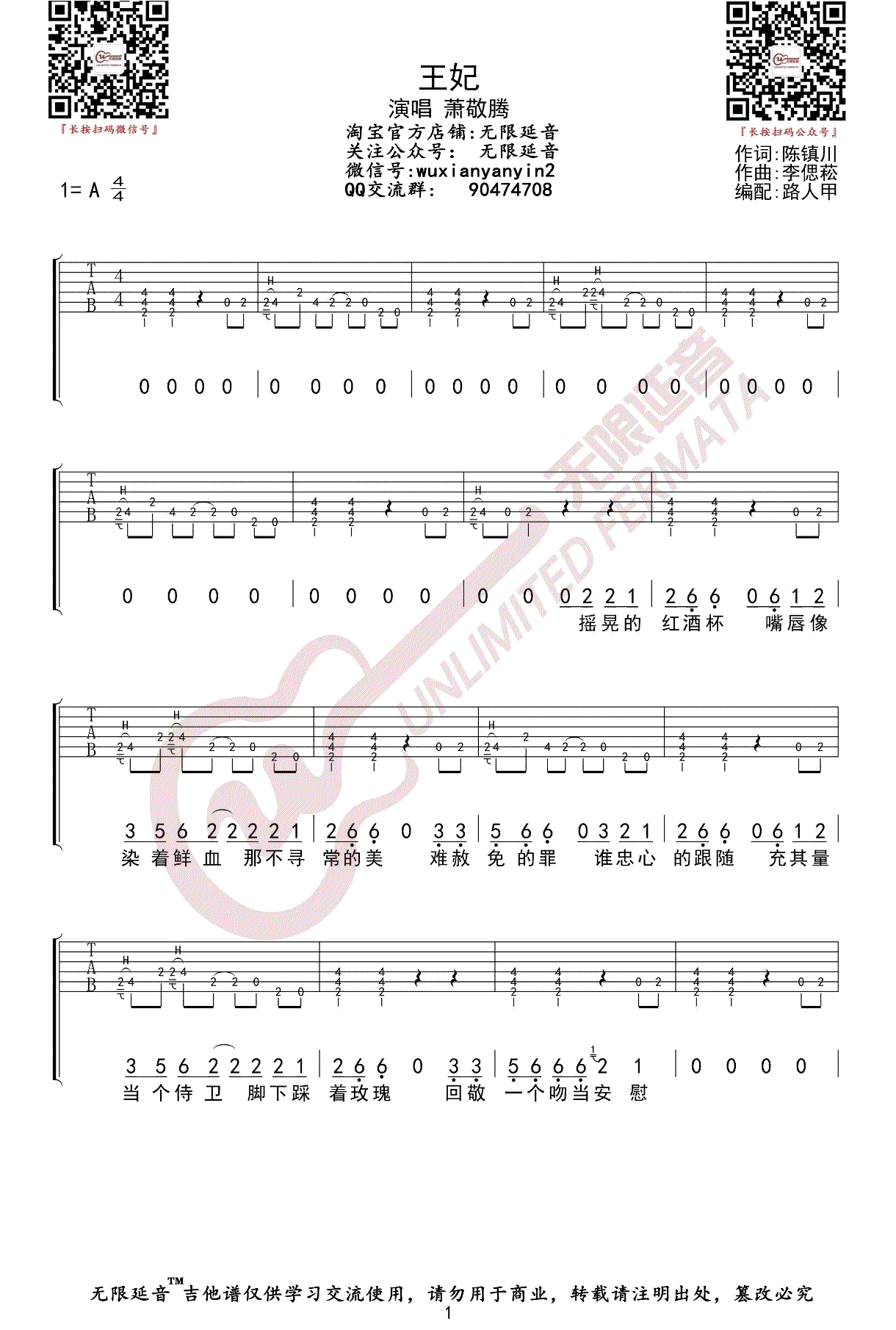 曲谱介绍: 《王妃》吉他谱,萧敬腾的一首代表作品,王妃六线谱,A调指法编配,三张弹唱图片谱。无限延音制谱出品,琴谱网上传更新。一首动感十足的歌曲,唱出即便粉身碎骨,也要勇敢坚定去爱的信念,表现了一种在爱情中征服的感觉,燃到沸腾,KTV的必选曲目。
