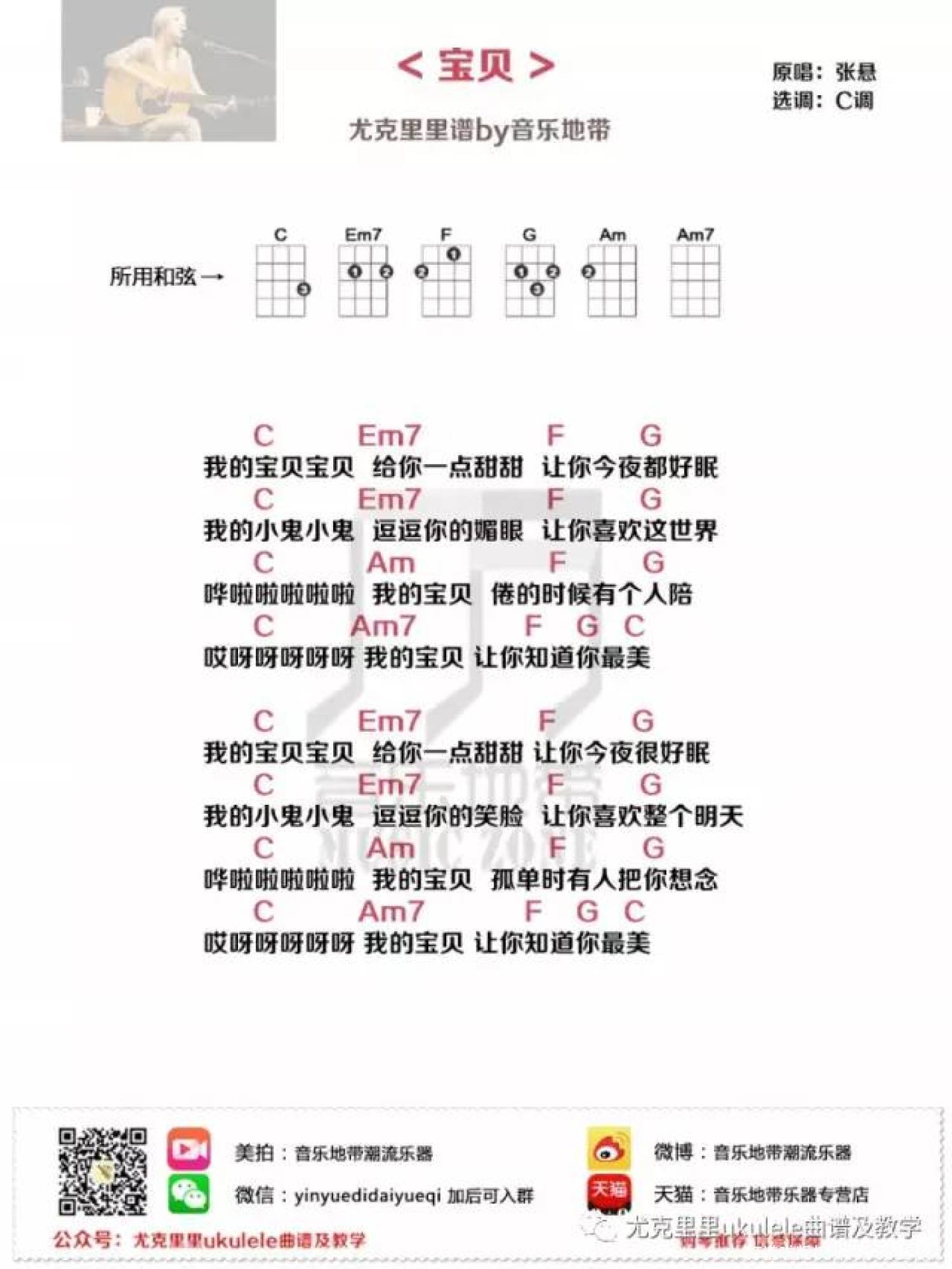曲谱介绍: 张悬的《宝贝》的创作对象是她自己 当时写这首歌的时候张悬还是个孩子 13岁和家人吵架就跑出去 后来哼唱出这首歌 只是借这首歌来自我安慰 就是小孩子渴望得到父母的关爱   张悬说 很多人喜欢《宝贝》这首歌 给我的回馈是,会对女儿唱这首歌 对情人唱这首歌、对父母唱这首歌 但他们从来不对自己唱这首歌,没有人会把自己当宝贝 我突然觉得大家对於自由 简单或是实现梦想充满了期待跟最后一点的无助 而那个无助让你感到退却或自卑   尤克里里教学   曲谱