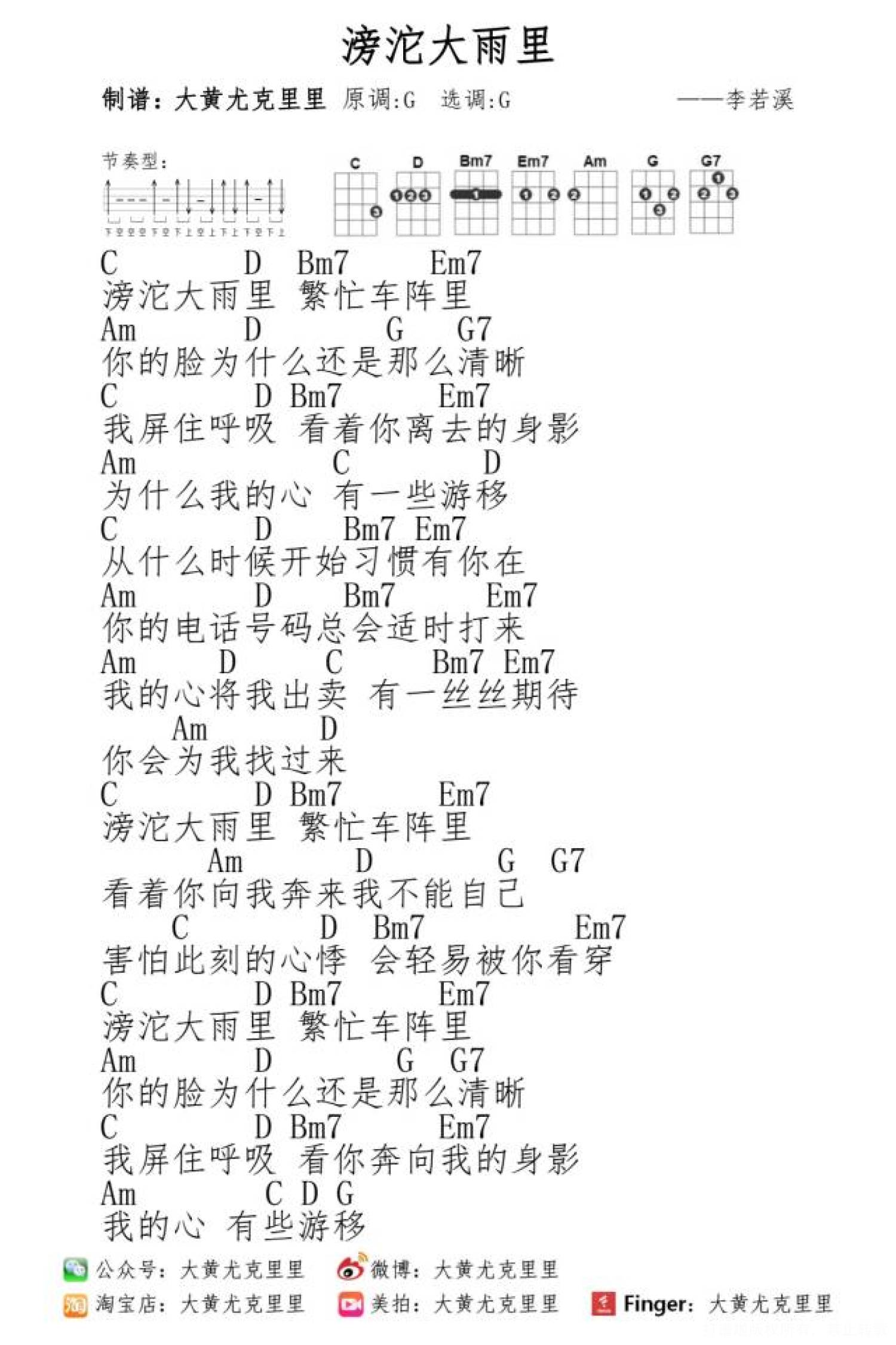 曲谱介绍: 《滂沱大雨里》尤克里里弹唱谱