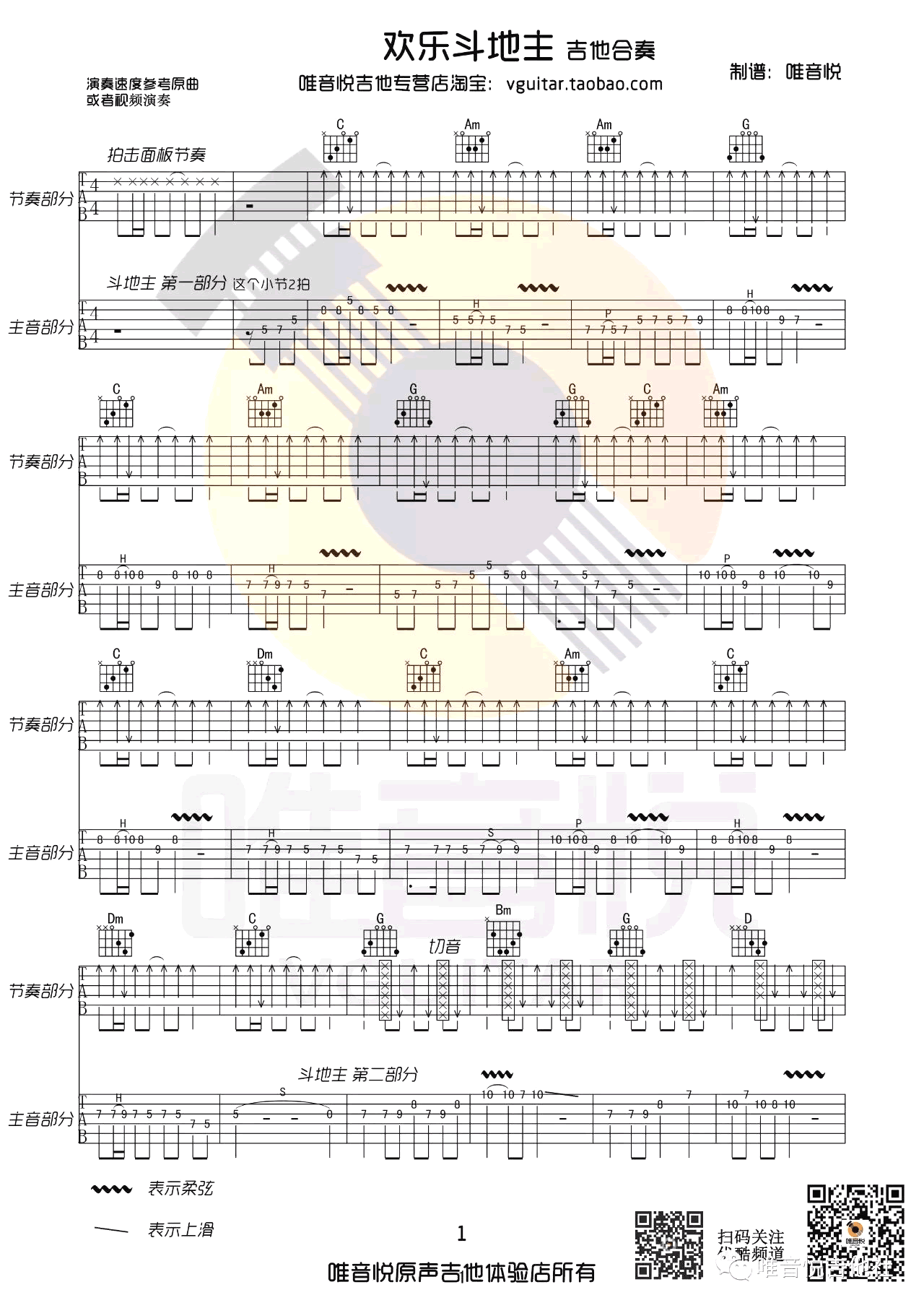 曲谱介绍: 欢乐斗地主指弹吉他谱,根据腾讯游戏背景音乐改编,欢乐斗地主吉他谱,双吉他合奏版本,双吉他版本,唯音悦编配出品。