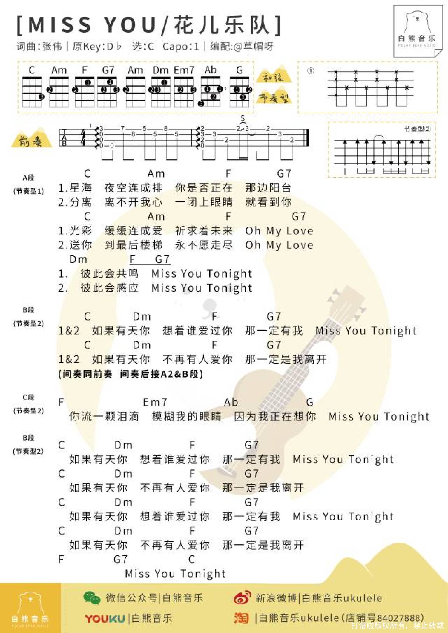曲谱介绍: 不再有人爱你 那一定是我离开 《Miss You》尤克里里弹唱谱