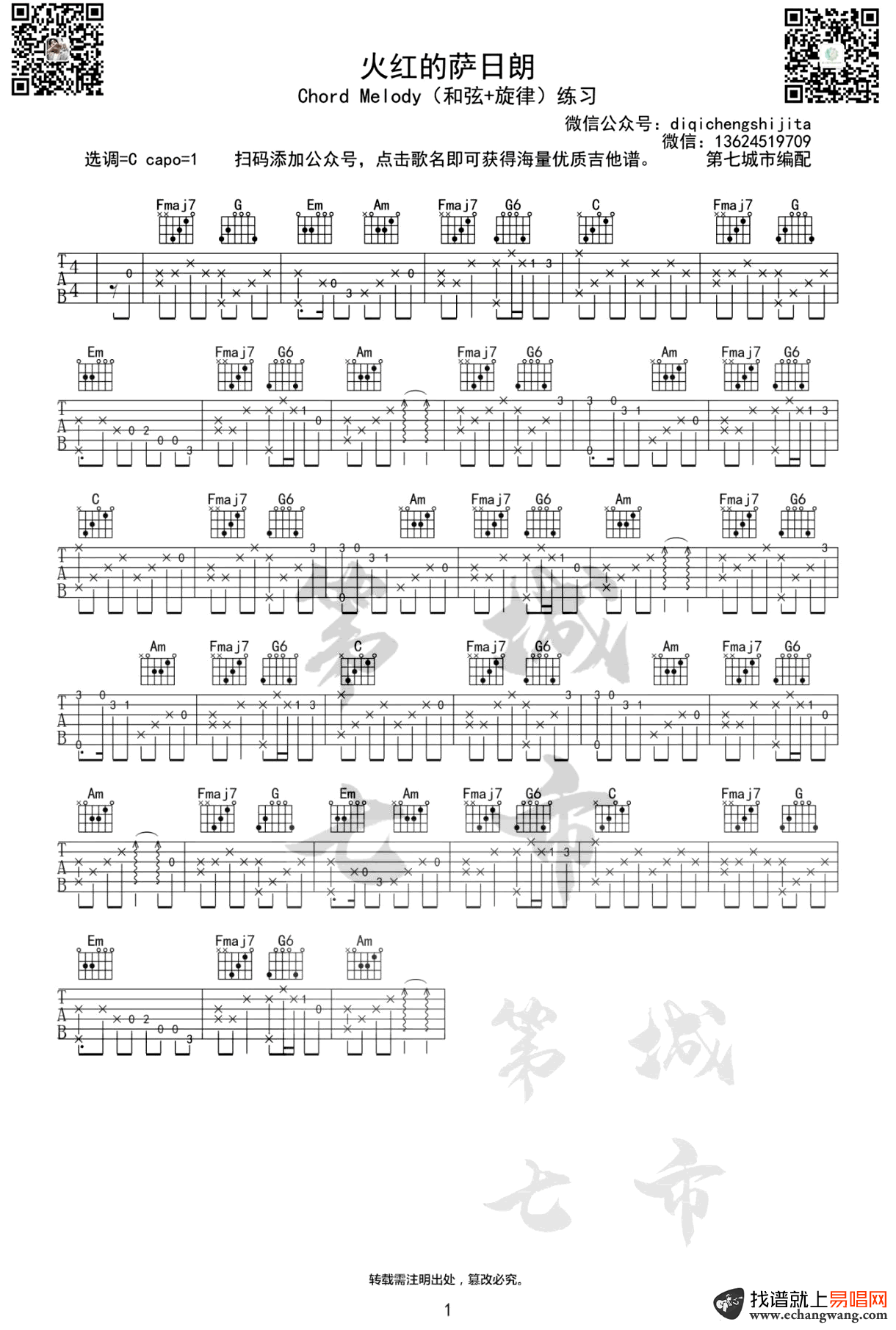 火红的萨日朗吉他谱 - C调吉他独奏谱