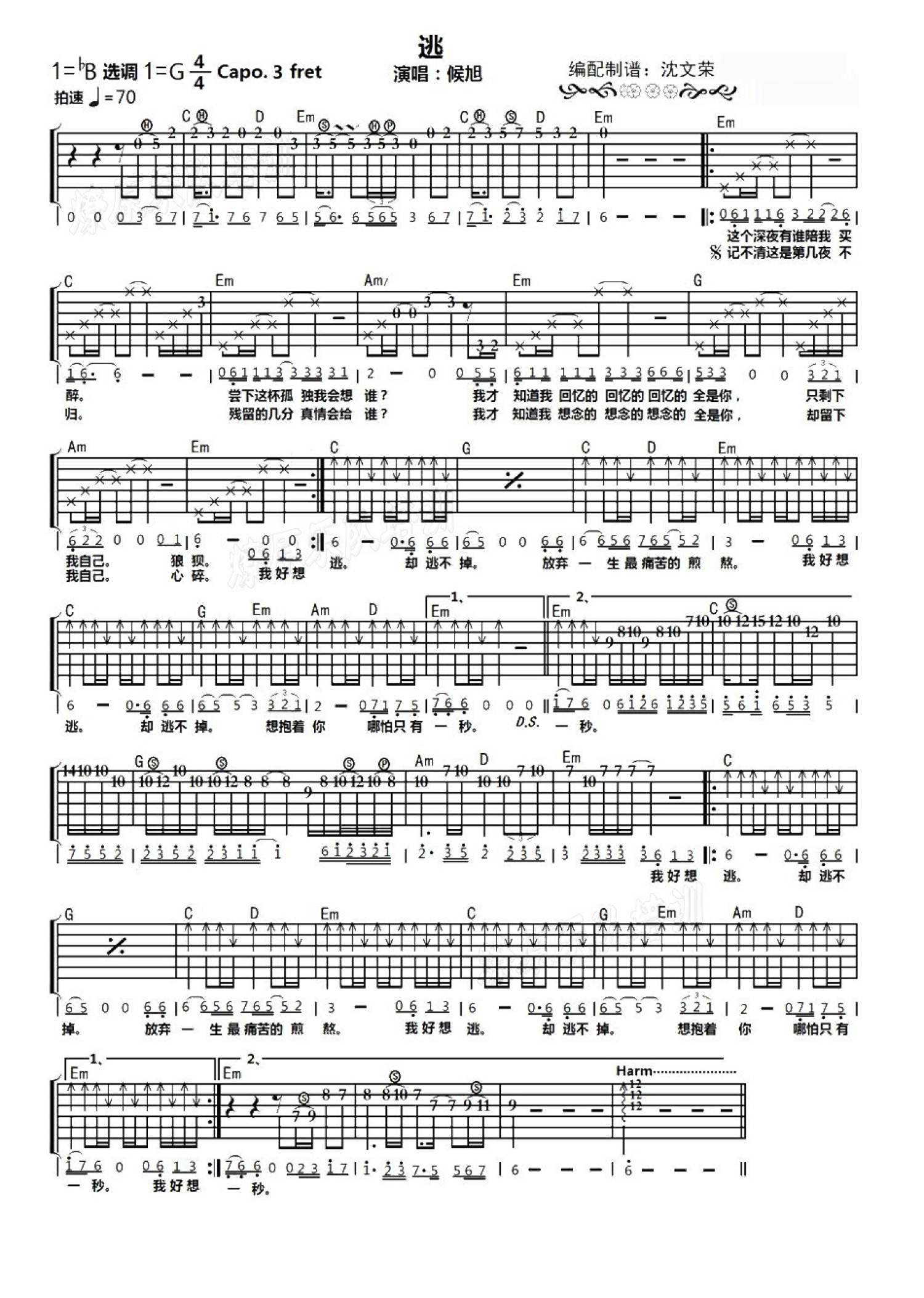 曲谱介绍: 逃吉他谱_侯旭,本曲谱采用G调,夹三品位置,歌曲的速度为70bpm.
