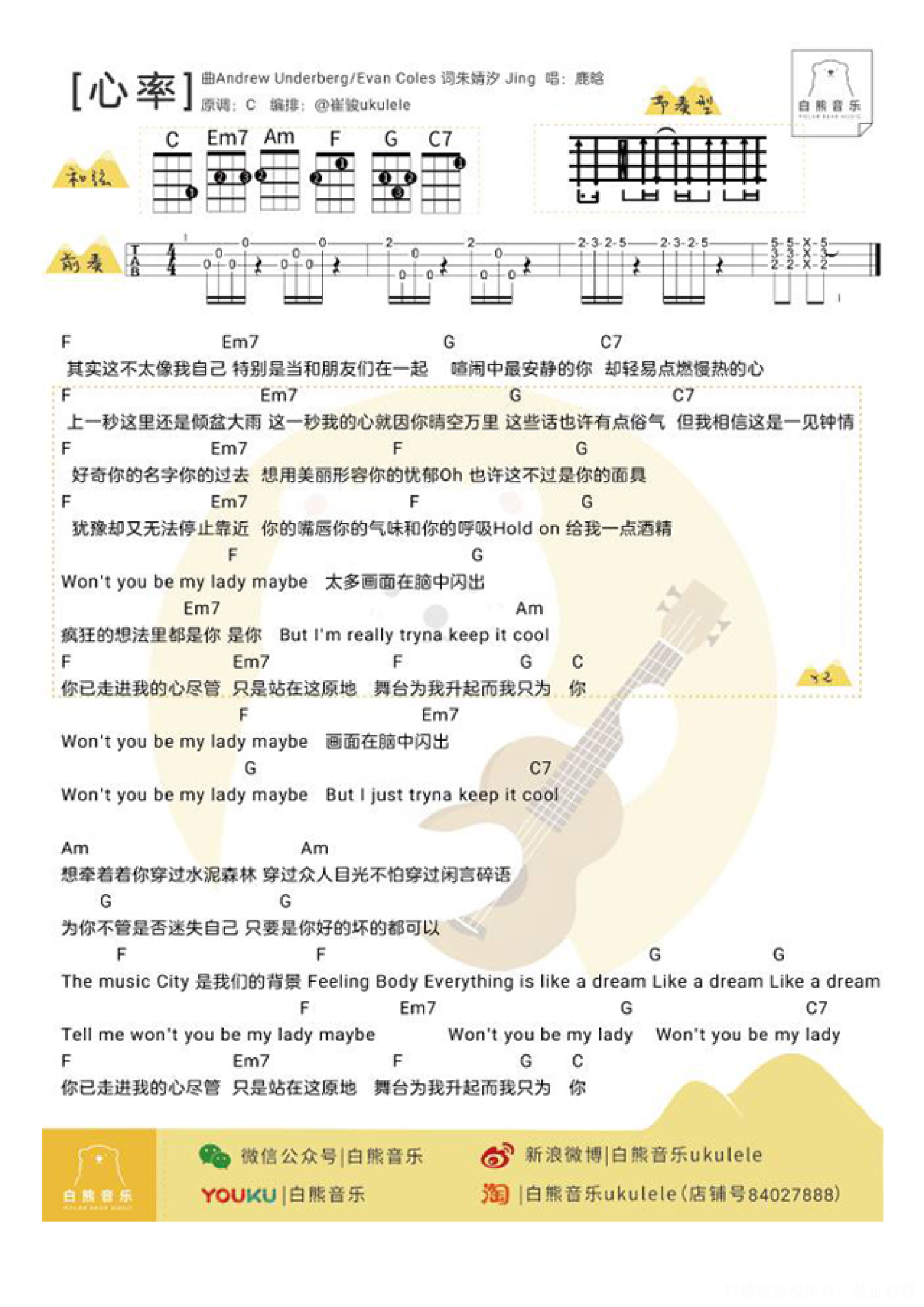 曲谱介绍: 鹿晗曾说有了恋情就会直接在微博公布。 在年初浙江卫视的跨年演唱会上鹿晗也曾许愿,“2017年,我就又长了一岁,还是想把音乐做得更好,然后有机会谈一场恋爱,结束单身状态。”说到做到了~不管如何,祝福他们吧~   心率 尤克里里谱
