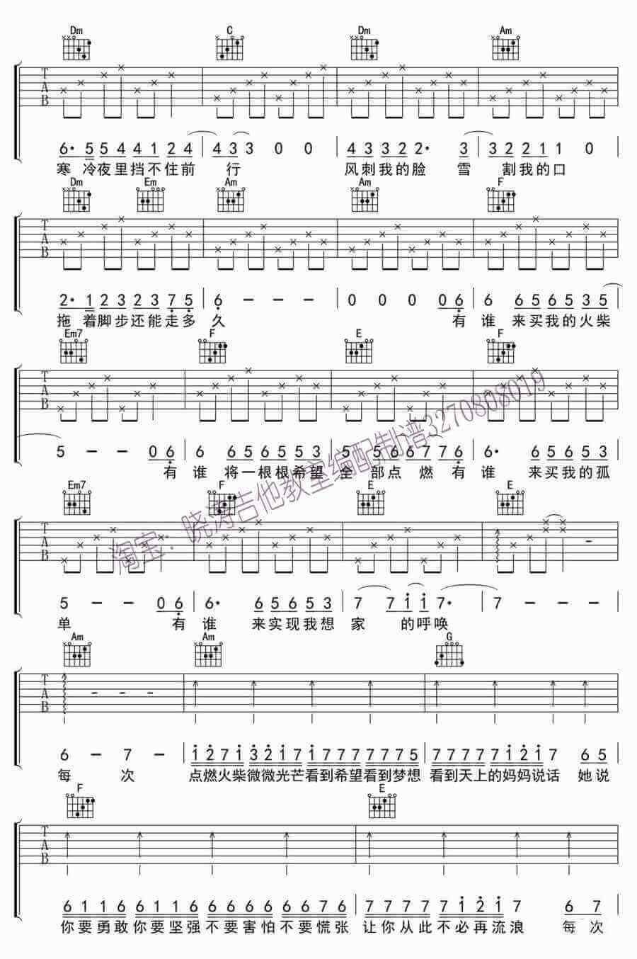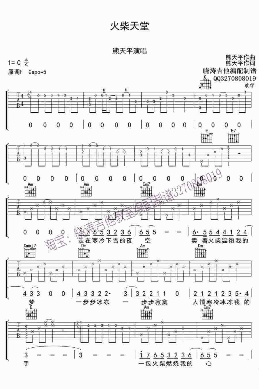 曲谱介绍: 熊天平火柴天堂吉他谱,原调F,变调夹夹5品。火柴天堂吉他谱,C调六线谱,图片高清版。儿时最熟悉的童话故事,被纯净的声音唱入旋律。副歌部分的紧凑,几乎唱出了悲怆中的一丝丝温暖。