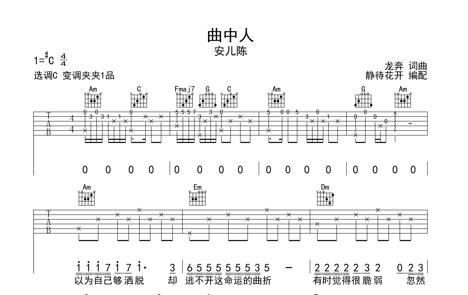 曲谱介绍: 曲中人吉他谱,共两张图片谱,《曲中人》吉他弹唱谱,本谱采用C调和弦指法编配,节奏4/4拍,曲速70拍每分钟,弹唱建议变调夹夹1品,指法简单,本谱由@静静之玛瑙制谱上传。
