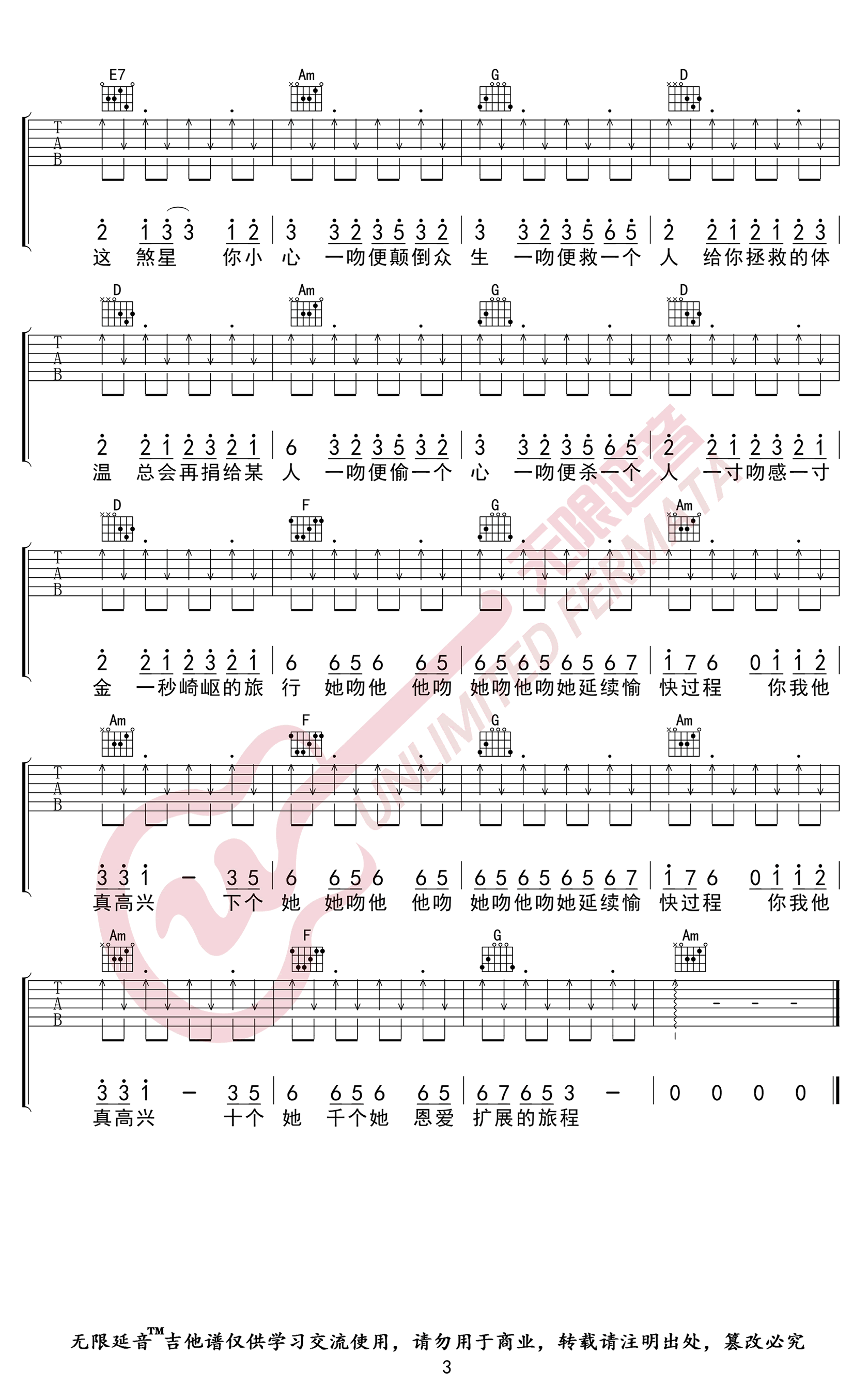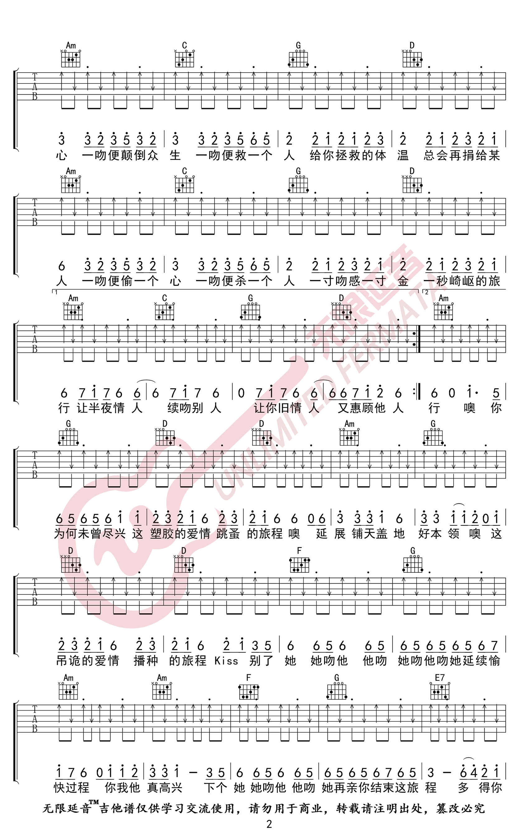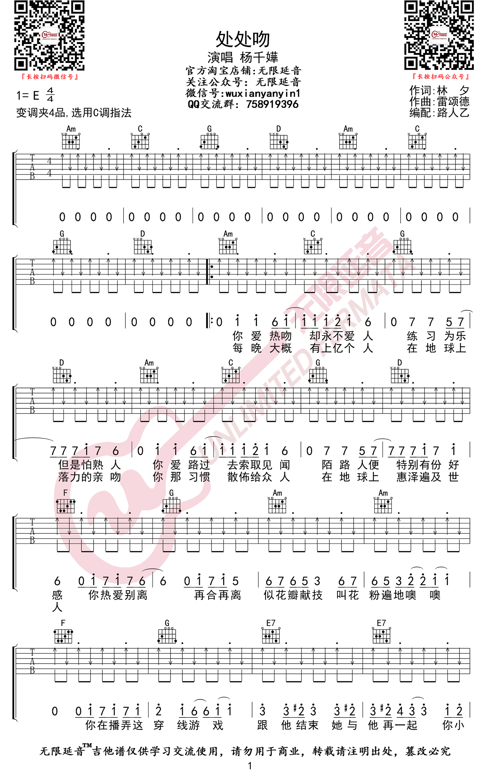曲谱介绍: 《处处吻》吉他谱,杨千嬅演唱的一首经典情歌,处处吻六线谱,原调E选调C,变调夹夹四品,三张弹唱图片谱。无限延音编配出品,琴谱网吉他谱更新上传。 一听就会心动的歌曲,节奏轻快,曲词流畅。像是哥哥的倾倒众生,像是小李子的深情不悔,像是王祖贤的风华绝代,像是兰普林的风姿绰约那些美人。一吻便颠倒众生,一吻便救一个人,一吻便偷一个心,一吻便杀一个人。