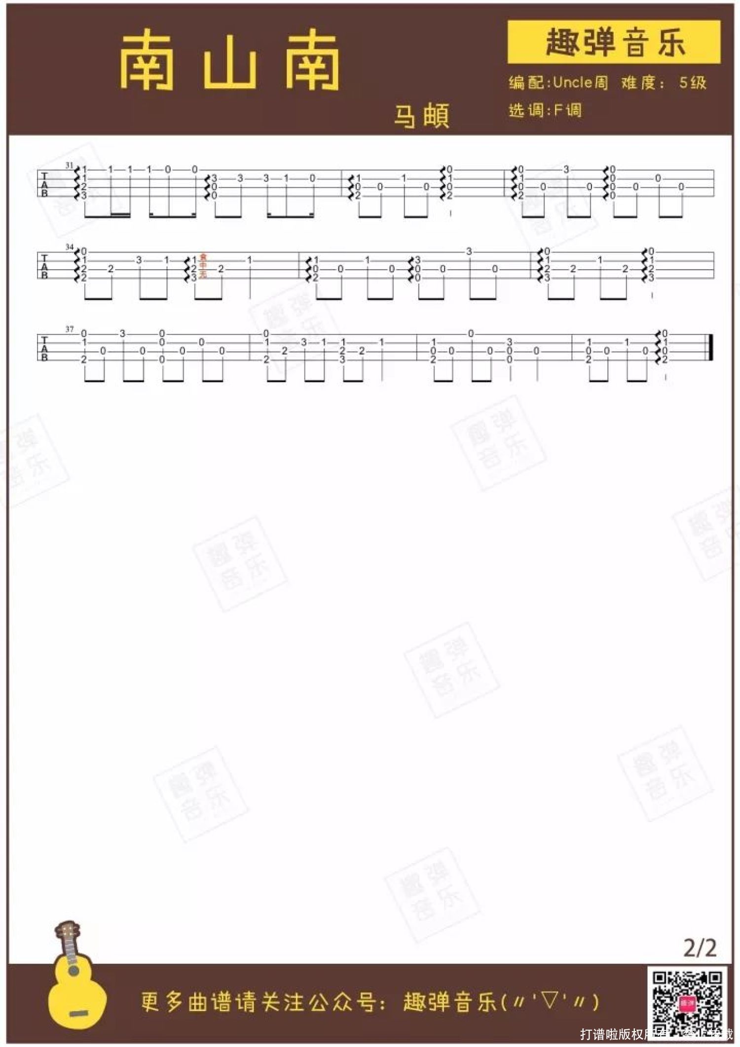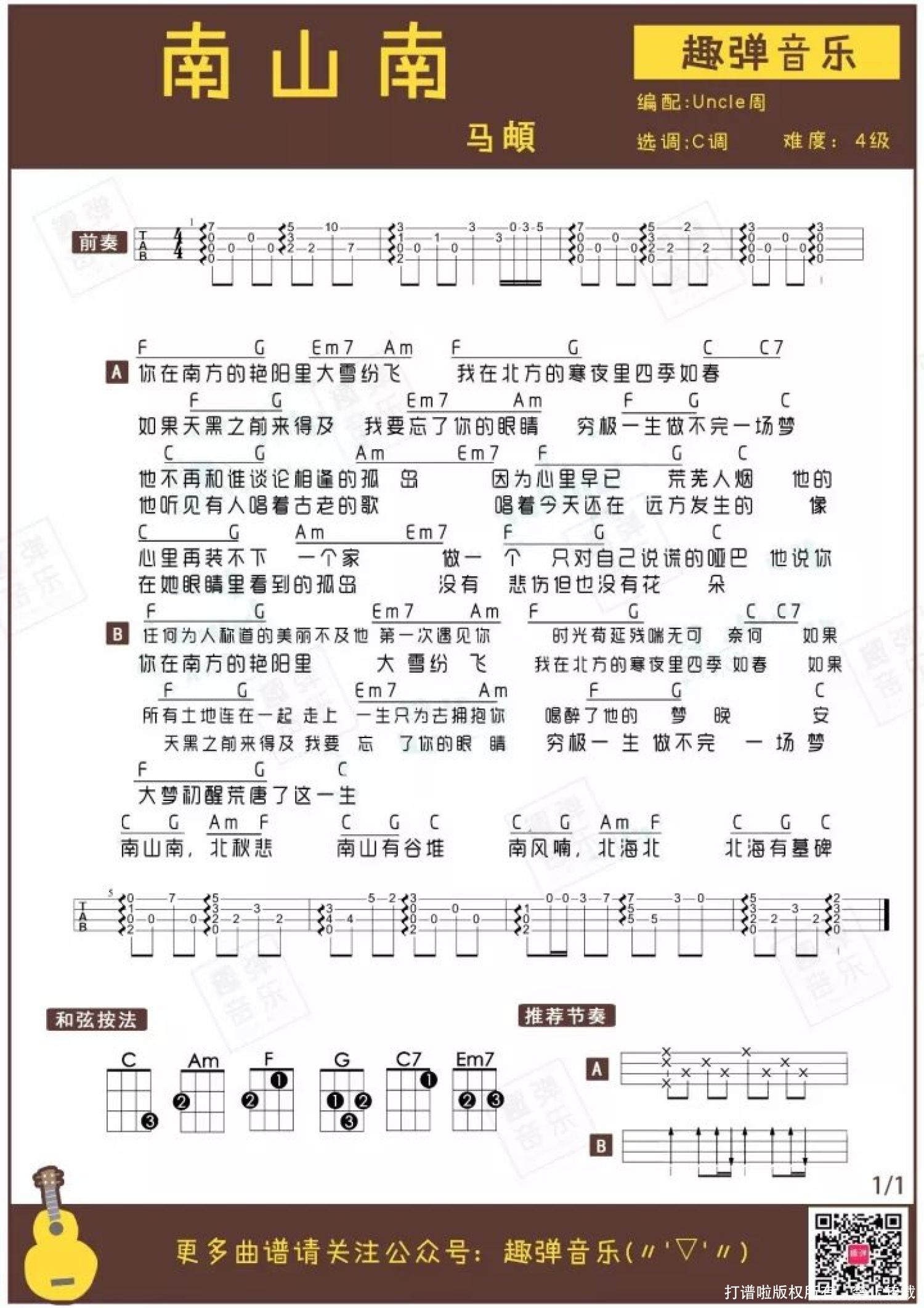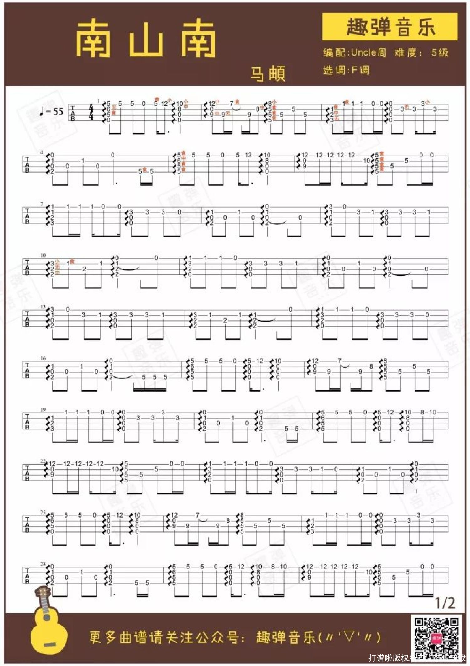 曲谱介绍: 没有了歌词的寂寞与悲伤,只剩旋律的指弹版<南山南>,竟有了一丝催眠曲的感觉~ 虽然还没大雪纷飞,但身处南方的小编已经被冻得瑟瑟发抖了,吓得我赶紧拿起琴弹弹这首民谣,让睡前的被窝暖和一点~ 和我一起弹吧,好吗~   指弹演示 《南山南》指弹版 改编:Uncle周 用琴:艳阳20T //吉他伴奏下载 大家练熟歌曲之后,就可以跟着吉他伴奏练习 百度网盘:http://pan.baidu.com/s/1cpoUD4   关于歌曲   ● 由独立民谣音乐人马頔原创的一首歌,是马頔的第一首单曲。 ● 收录在其2014年11月06日发行的专辑《孤岛》中。 “你在南方的艳阳里大雪纷飞,我在北方的寒夜里四季如春。” 这首歌没有前奏,开口第一句就让小编对北方的暖气产生了无限向往。 然而这并不是北方人在拉仇恨的一首歌~<南山南>身为一首正经民谣,讲的是与心爱的人分隔两地的有点忧桑的故事。 写下这首歌的马頔,是一位来自北京的独立民谣音乐人。 感谢马頔,带给我们这么好听的一首民谣,还让我知道了“頔”字怎么念。٩(๑❛ᴗ❛๑)۶(←小编文盲脸) 期待马頔带给我们更多好听的民谣~   指弹曲谱   附送:弹唱曲谱