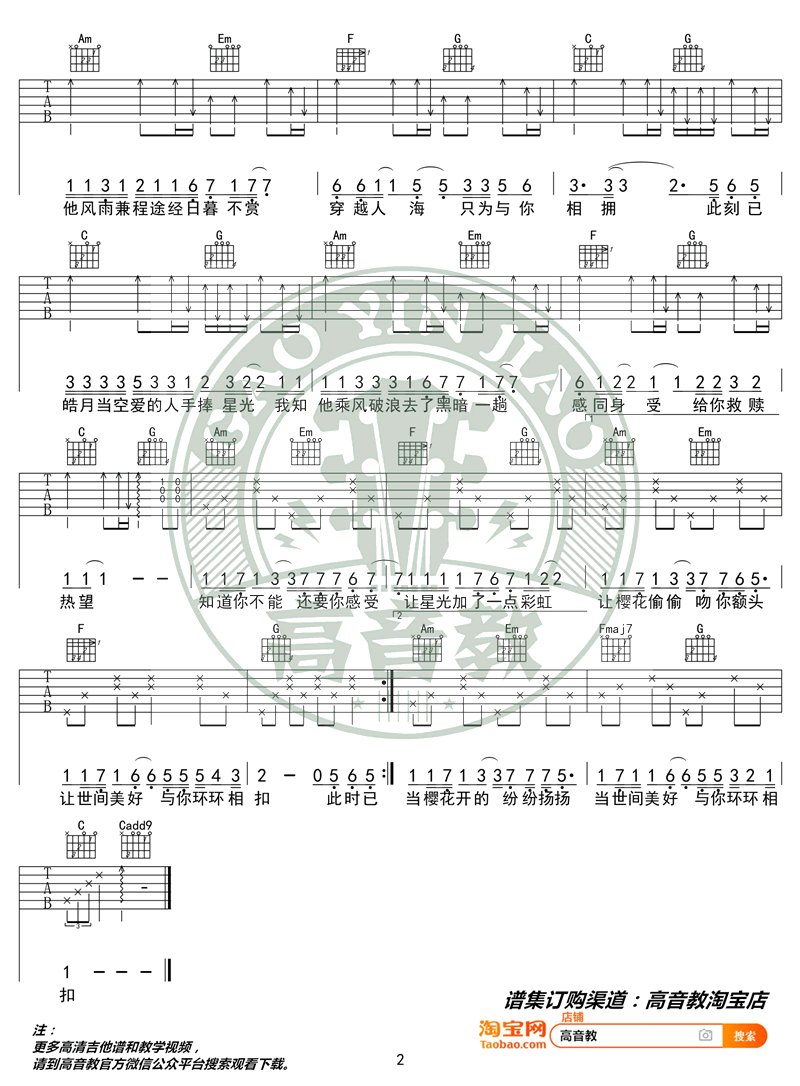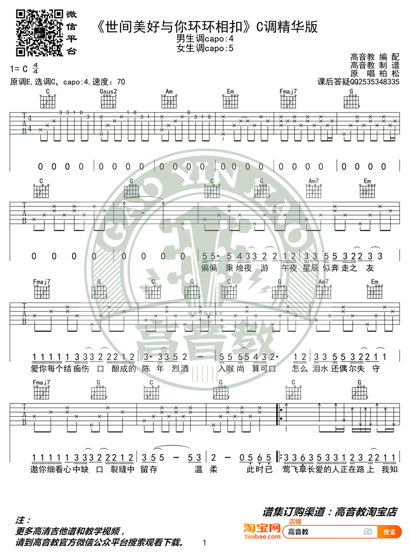 曲谱介绍: 世间美好与你环环相扣吉他谱,柏松演唱,一首网络热门民谣歌曲,C调精华版,变调夹推荐,男生4品女生5品。高音教编配出品,琴谱网上传更新。随谱附上猴哥老师为琴友们带来的吉他弹唱教学视频。