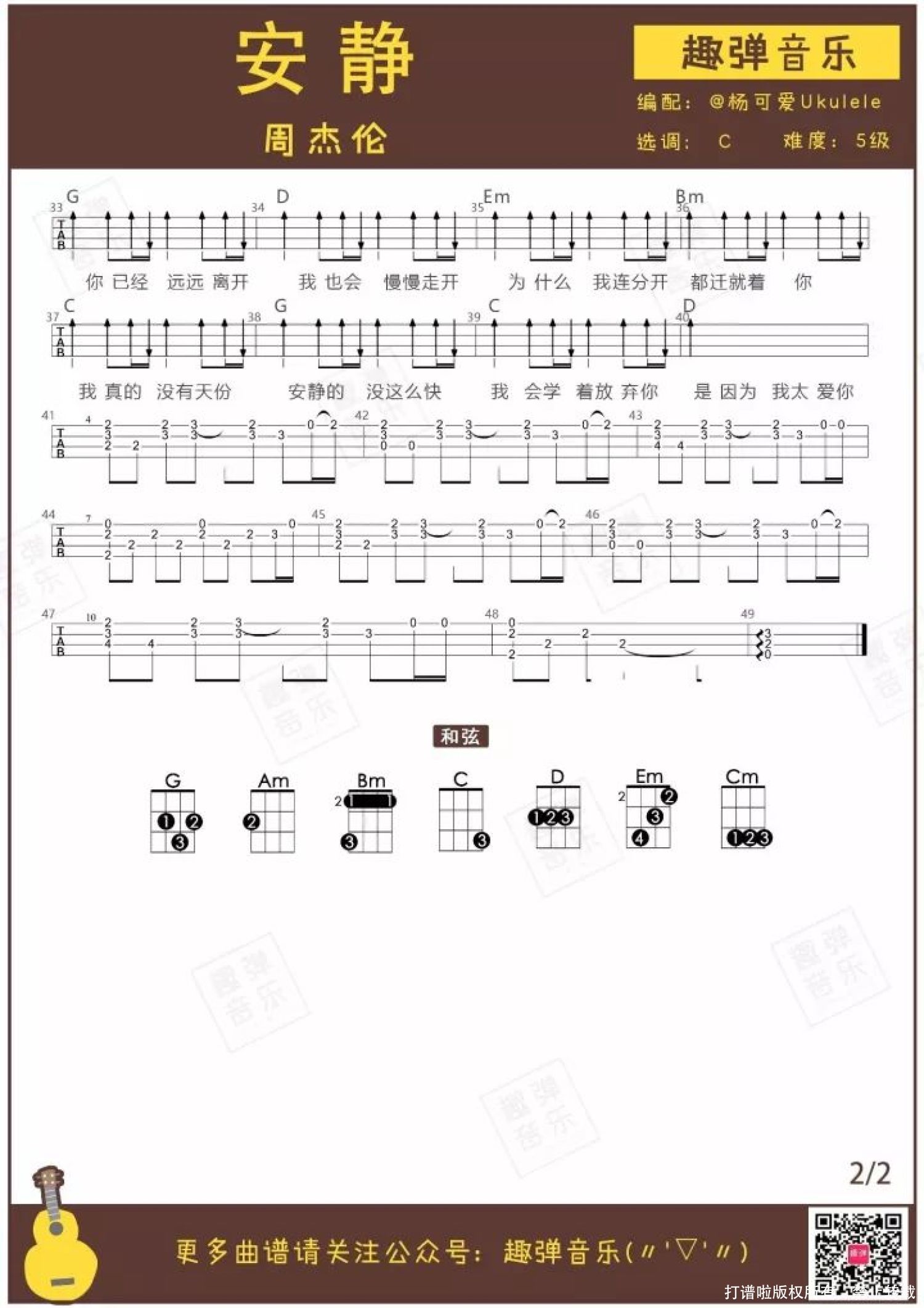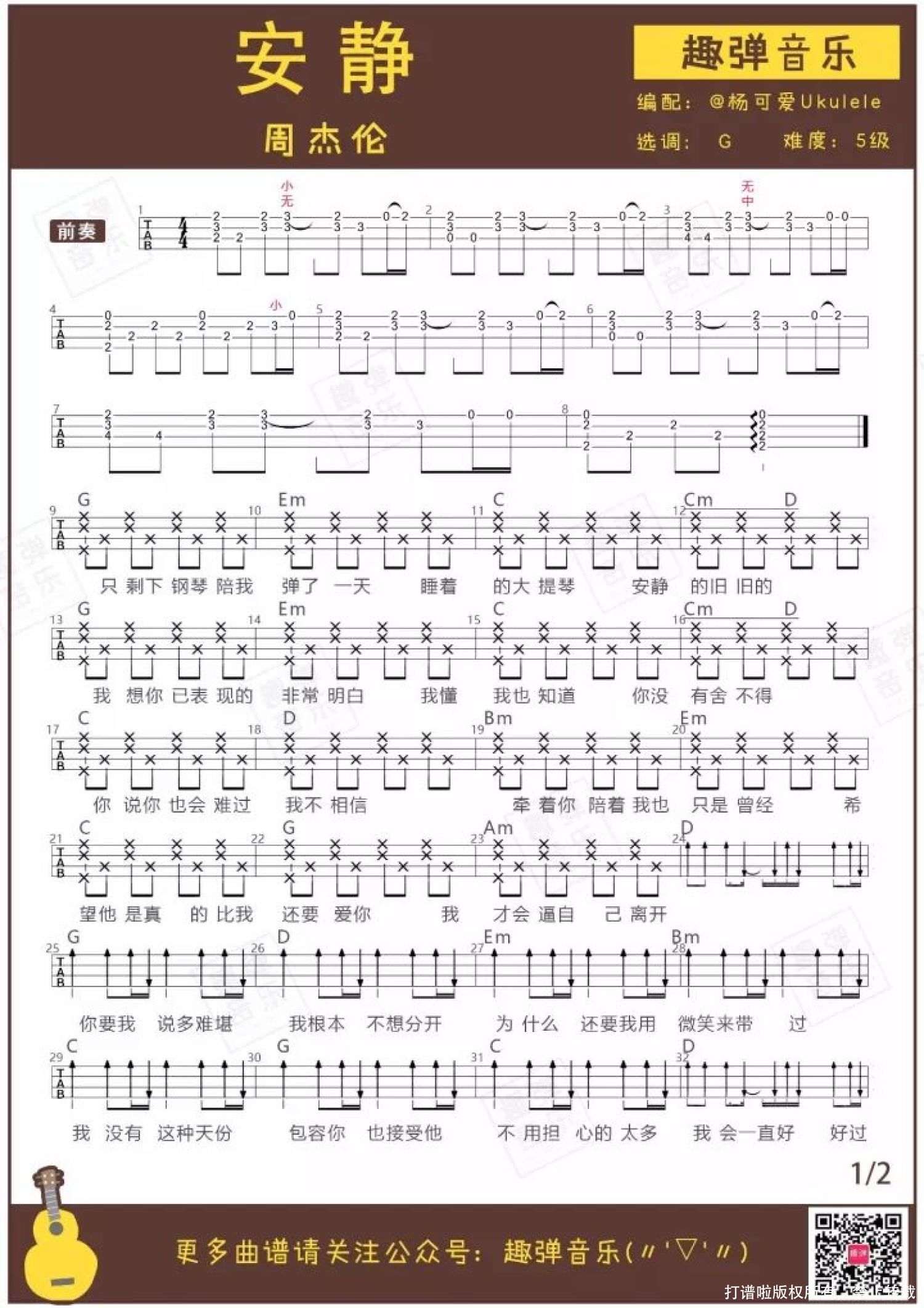 曲谱介绍: 这首《安静》是杰伦情歌中的经典,就如歌名一样安静,在KTV里绝对是点播率最高的曲目之一。 连唱几首热歌以后,来一首《安静》,平静动人的歌声一样可以吸引所有人的视线~ 让我们看看杨可爱带来的弹唱,有没有让你感受到《安静》所带来的吸引力呢?   弹唱MV 《安静》ukulele弹唱 弹唱:杨可爱 / 伴奏:Uncle周 用琴:艳阳20T   关于歌曲 ● 由周杰伦作词作曲并演唱,收录于专辑《范特西》中。 ● 2002年这首歌曲获得了第二届全球华语歌曲排行榜颁奖礼最佳金曲奖。 歌曲MV呈现的画面里,一个昏暗的角落,只有一架钢琴陪伴着杰伦。 在创作这首歌时,杰伦想到的是小时候在僻静角落练琴的时光,仿佛全世界只剩下他和琴声。 “我会学着放弃你,是因为我太爱你。”有一种深情叫做适可而止。杰伦的情歌中,总会有一句特别戳人心窝的歌词,让人忍不住在纸上记录下来,偷偷在心底保存。   歌曲教学   弹唱曲谱