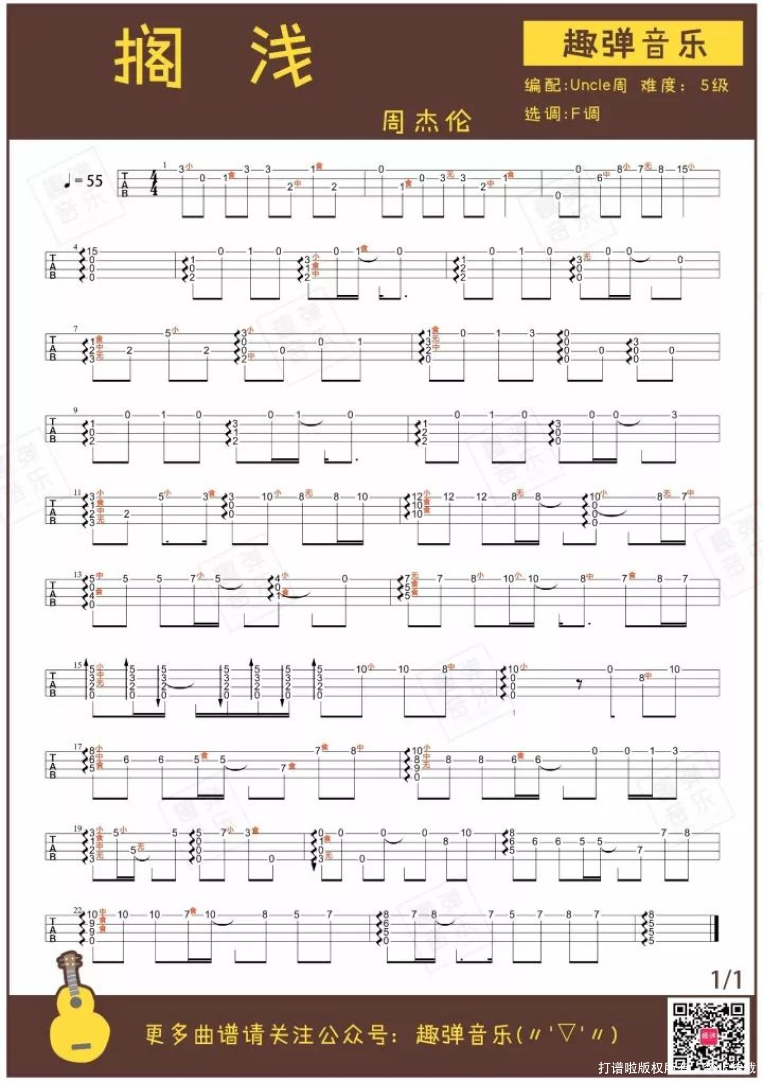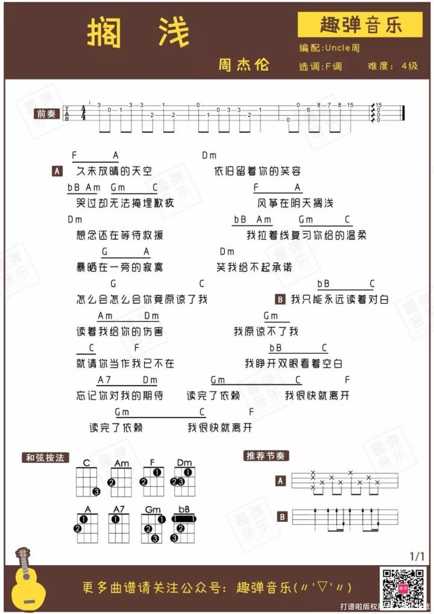 曲谱介绍: 如果我的歌单里只能有一位歌手的歌曲,那位歌手一定是周杰伦。 2016年北京演唱会上,周杰伦和歌迷一起合唱《搁浅》,一下子就把人带回到了在被窝里偷偷听歌的青春时代。 当《搁浅》的旋律在小U的琴弦间响起时,即使是简单的音符,却也能一下子还原那些被周杰伦承包的青春记忆。 那个时候,还没有小巧便携的mp3,只有一卷卷的磁带。那部本该用来练习英语听力的复读机,被我们躲在被子里播放最多的却是这首《搁浅》。那本本该用来誊写学习笔记的本子,最后却被抄满了周杰伦的歌词。 长大后再听周杰伦,除了觉得歌曲本身好听之外,更多是一份青春时代的情怀。 拿起小U,和Uncle周一起回忆青春吧♪   指弹演示 《搁浅》/周杰伦 改编:Uncle周 用琴:艳阳20T   //吉他伴奏下载 大家练熟歌曲之后,就可以跟着吉他伴奏练习 百度网盘:http://pan.baidu.com/s/1qYdWGrU   -学前必修课程 【指弹零基础 第11课】-   关于歌曲 ● 由宋健彰作词,周杰伦作曲并演唱,收录于专辑《七里香》中。 ● 歌曲MV讲述了一名医院清洁工与住院病人相爱的故事。 杰伦经典的情歌实在太多,非要挑出十首,一定不能缺这首《搁浅》。 杰伦用一种接近呐喊式的情感爆发来表现,给这首歌增添几分悲伤与心痛。 歌曲MV中,医院清洁工与住院的女孩相爱的故事,也为它在杰伦情歌中的排位上助攻了一把。 微电影般恋爱叙事向的MV、令人悲伤心碎的旋律,再加上师弟宋健彰触景生情的歌词描写,这首歌成为周氏情歌代表一点都不夸张。   指弹曲谱 附送:弹唱曲谱