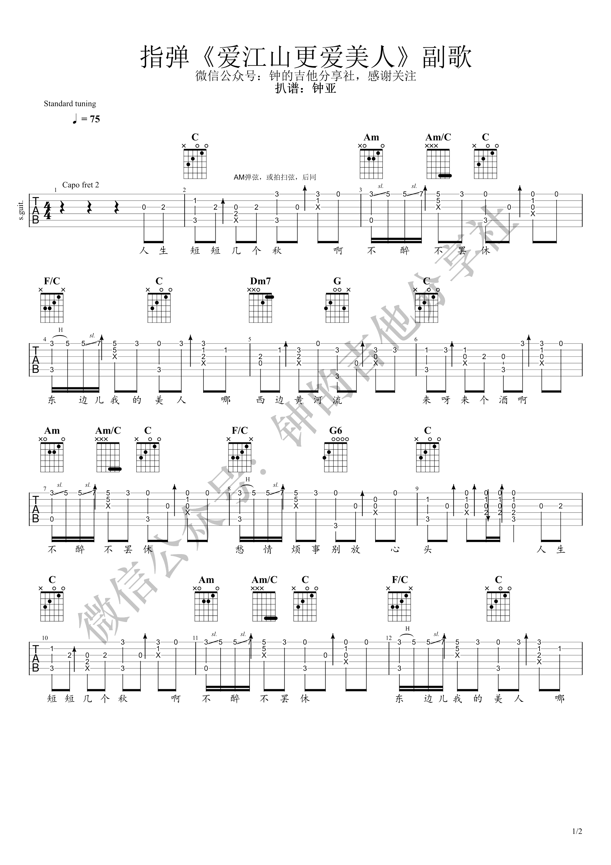 曲谱介绍: 爱江山更爱美人指弹谱,根据李丽芬演唱的一首经典歌曲改编。爱江山更爱美人吉他独奏谱,两张图片谱例,随谱附上指弹演奏视频,感谢钟的吉他分享社出品,琴谱网整理上传。 这首曲子钟亚老师只编了副歌部分,琴友们可以很好地训练AM技巧。歌曲D调,变调夹加2品C调指法编配,副歌和弦级数走向大体是:1-6-4-5,很常见。