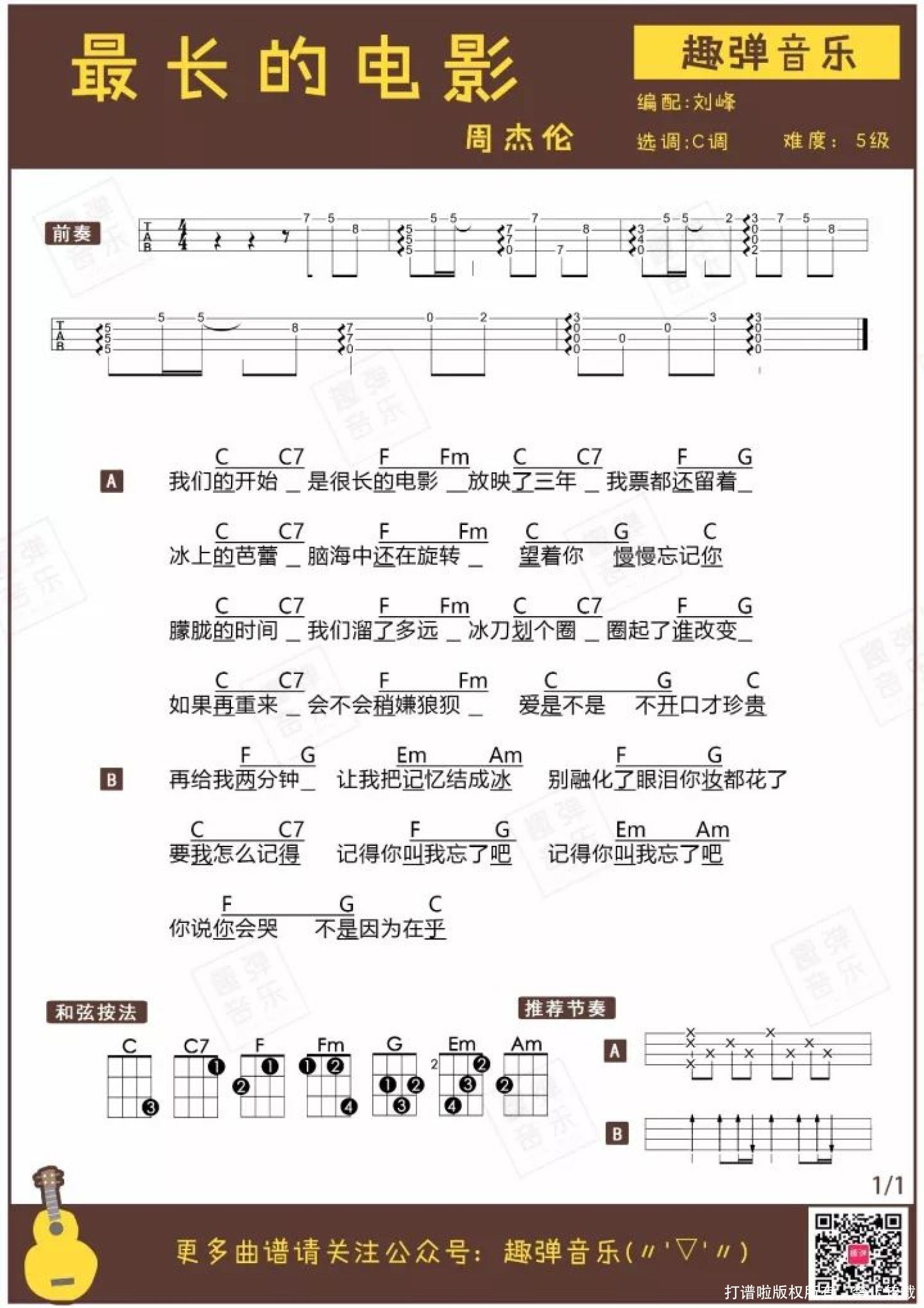 曲谱介绍: ● 由周杰伦作词,作曲,收录在周杰伦2007年发行的专辑《我很忙》中。 ● 周杰伦以男女之间微妙的感情为主题创作了这首歌曲。 看到这首歌的作词作曲、MV导演、歌曲原唱、制作人全都写着周杰伦的名字的时候,也就能明白为什么收录这首歌的专辑叫做《我很忙》了。 《最长的电影》MV中,讲述了一个爱上盲女的少年的悲剧故事。 然而在得知有人把歌词“再给我两分钟,让我把记忆结成冰”听成“再给我两份葱,让我把鸡翼煎成饼”以后,我听这首歌再也哭不出来了。   弹唱曲谱