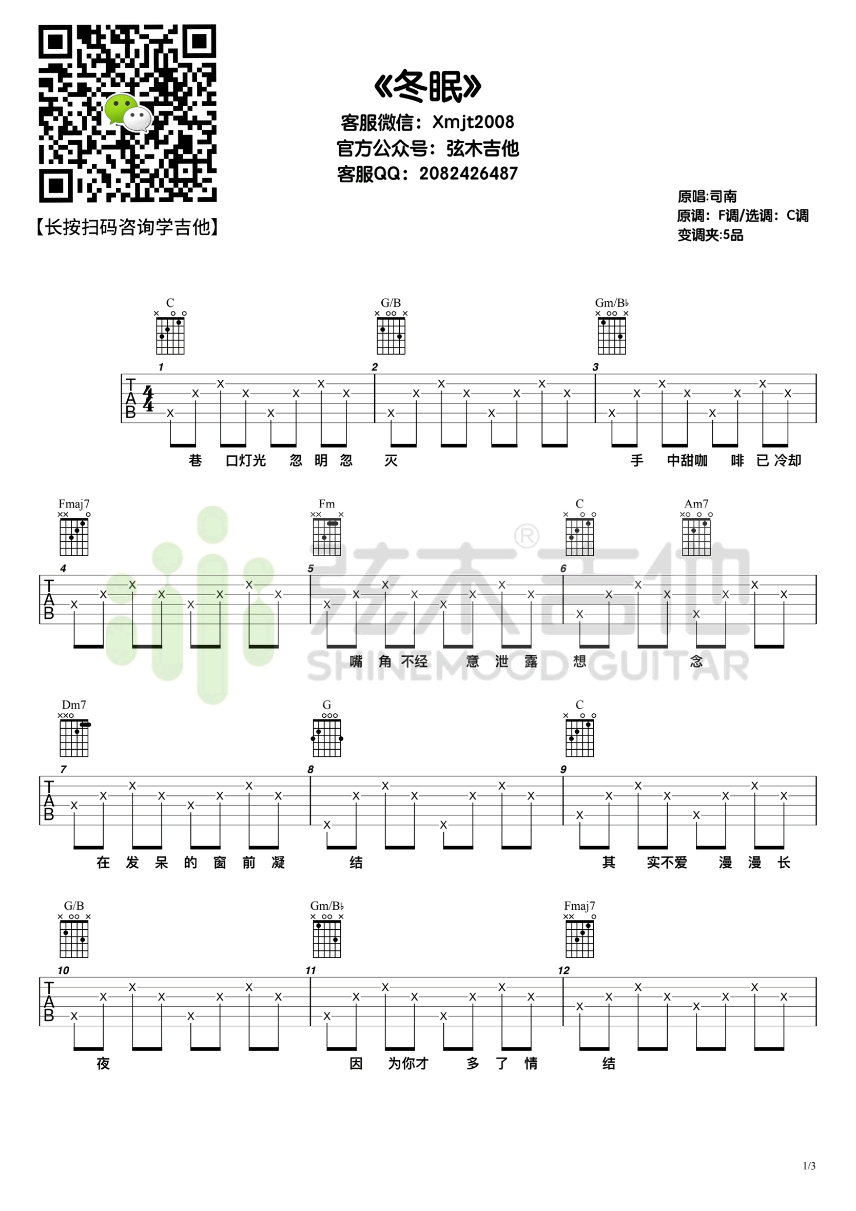 曲谱介绍: 司南《冬眠》吉他谱,原调F选用C调指法,变调夹夹五品。冬眠吉他弹唱六线谱,三张高清图片谱,感谢弦木吉他出品,琴谱网整理上传分享。 一首单曲循环让人细细诉说回忆的歌曲,轻柔的旋律,似冬日悠然飘落的雪花、翻飞轻盈,歌者干净的嗓音,紧紧抓住我们的耳朵,曾经挽留不住的感情,如今怀念亦释怀 。