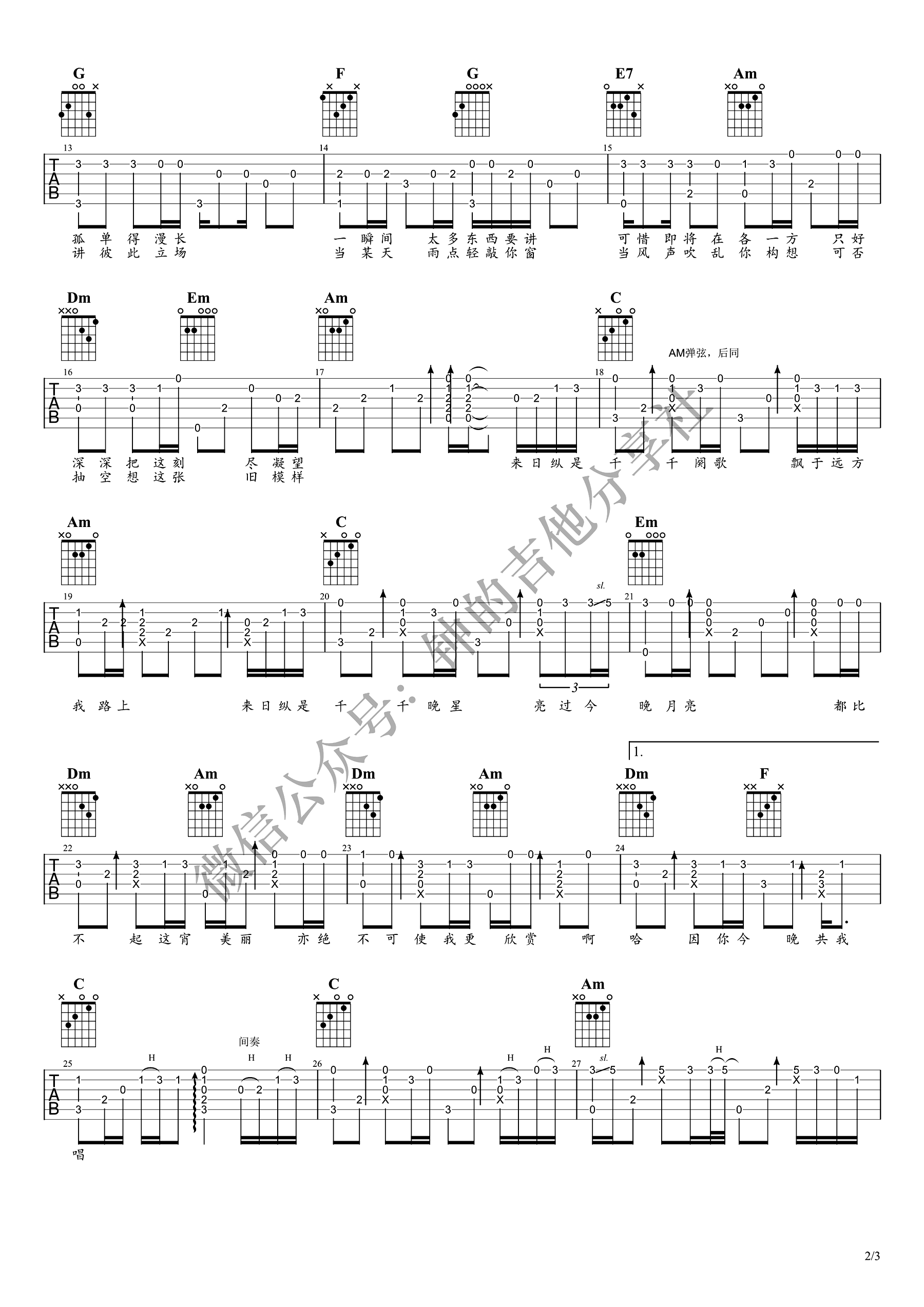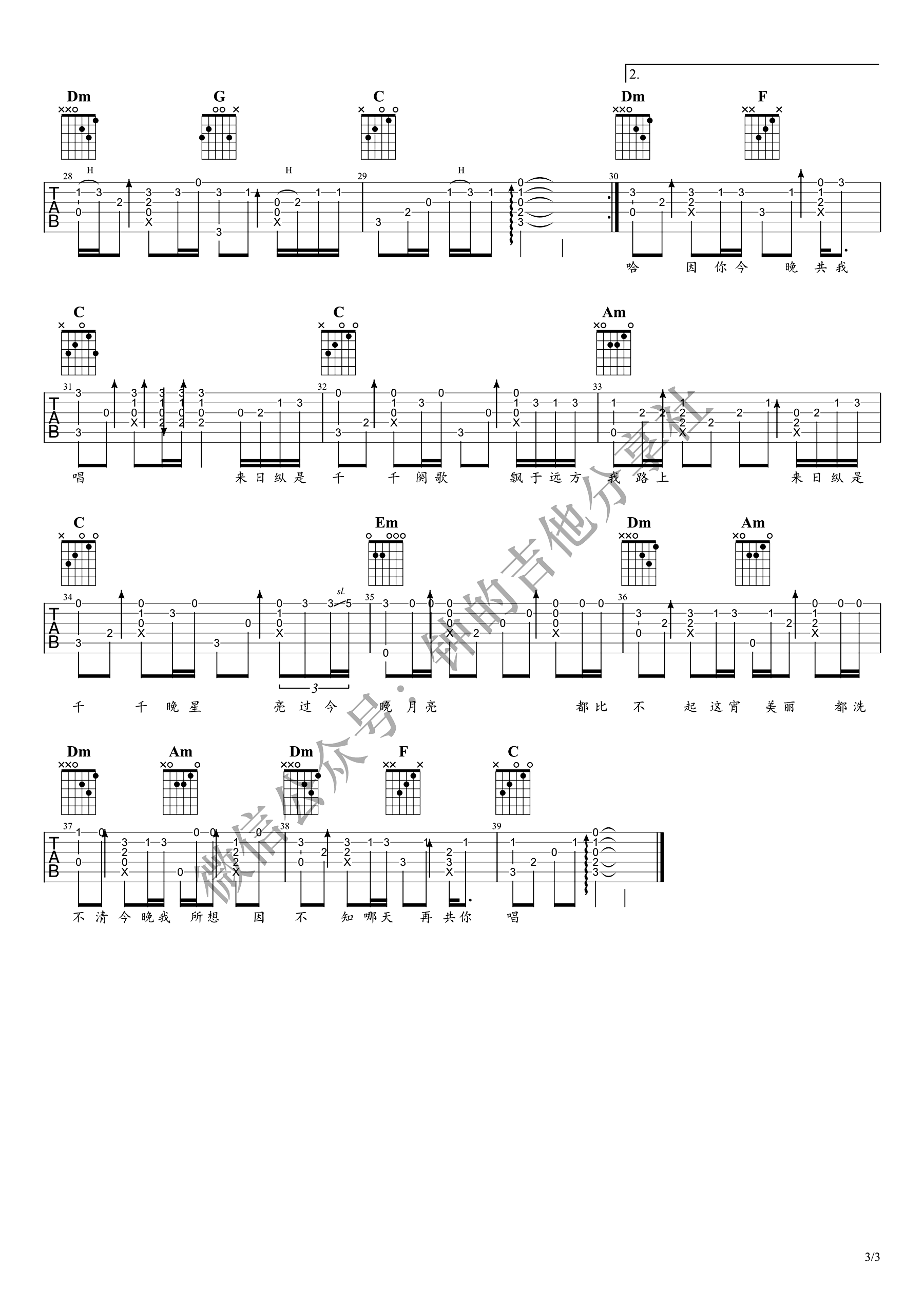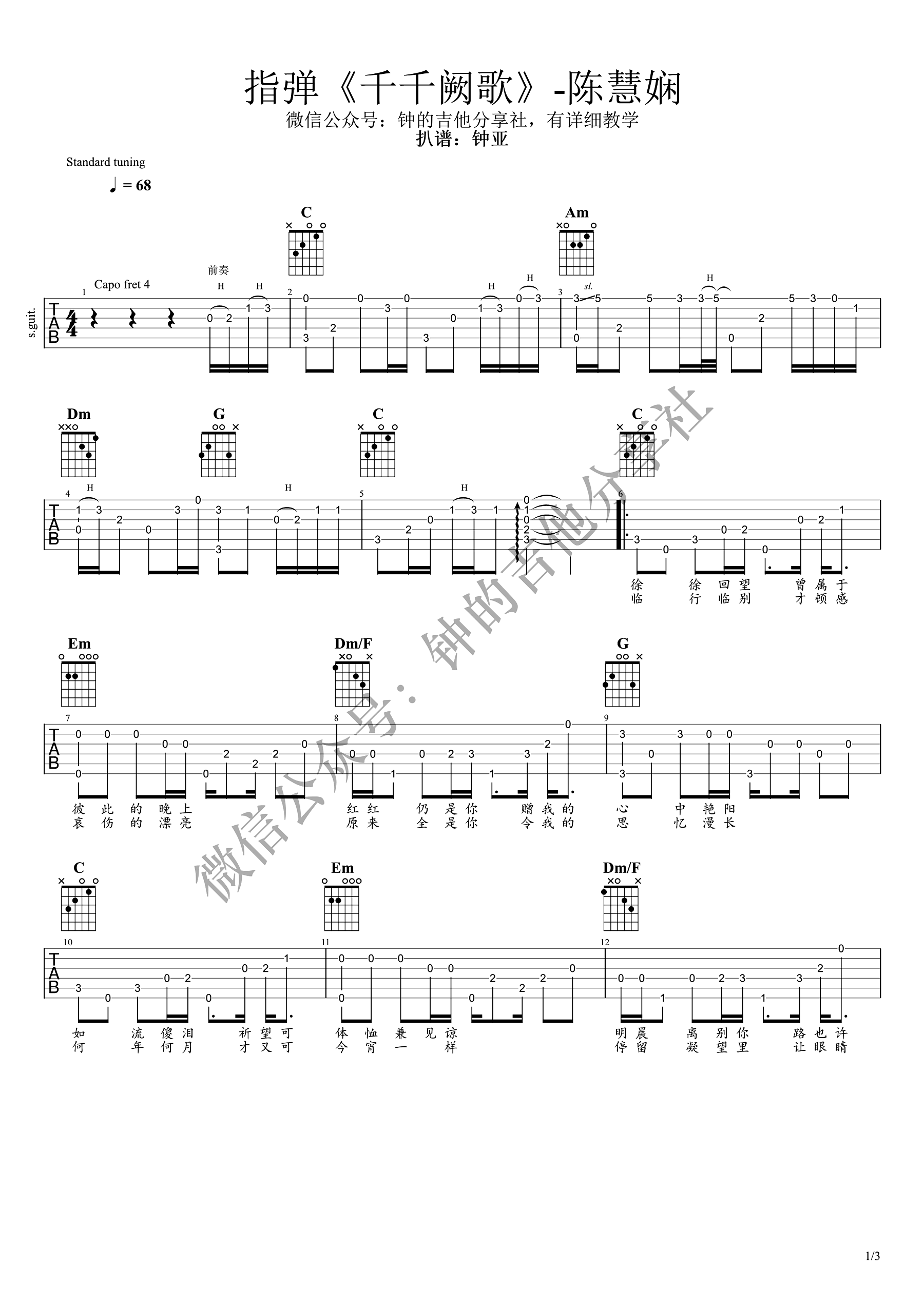 曲谱介绍: 《千千阙歌》吉他指弹谱,陈慧娴的经典代表歌曲改编,千千阙歌吉他独奏谱,钟的吉他分享社出品,随谱附上配套指弹吉他演奏视频,琴友们参照练习,琴谱网上传更新。 钟亚老师编配说明:歌曲原调E调,变调夹夹4品,C调和弦指法编配。C调各级和弦:C-Dm-Em-F-G-Am-Bdim(或G7) 和弦级数走向具体看下面的谱子自己分析。其实变调夹夹3品也很好听,大家可以自己试一试。